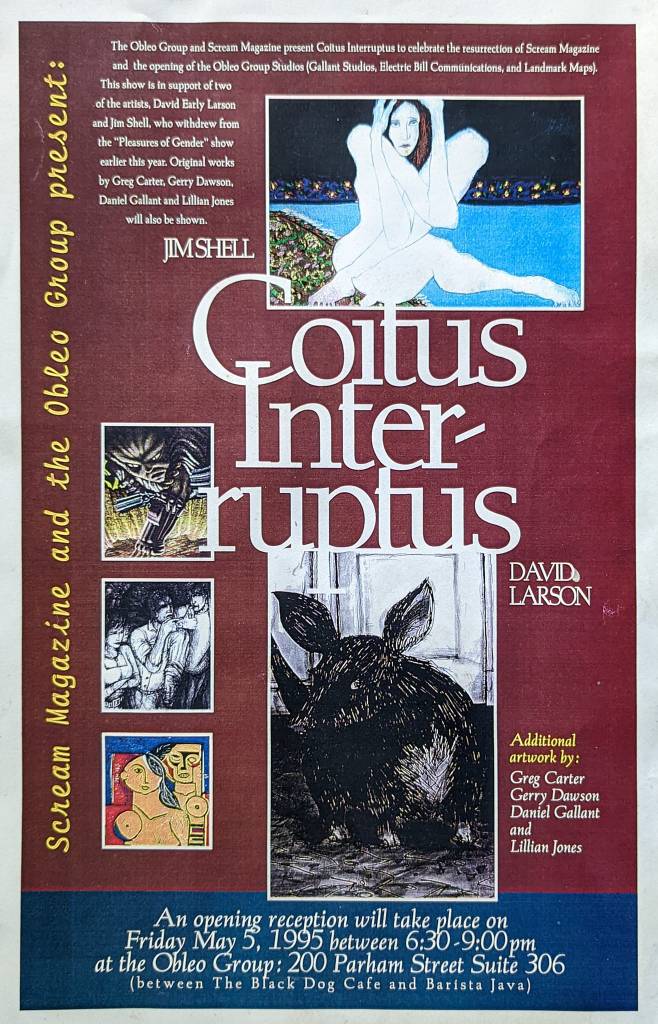 Danny Gallant, graphic designer for Scream magazine, says of the above: I curated the show as I was supporting many of the great artists I had gathered for the soon to be stillborn new Scream Magazine. David Larson‘s Dupp was the feature and a huge hit, but there was a ton of great art. Other notable folks are John Vannucchi, Caroline Branch, Jeff Rooney, Lillian Jones, Greg Carter, Katie Boone.