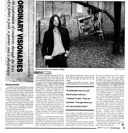 I became interested in Larson when I saw some of his work on display at The Paper Plant in Raleigh. His pastel drawings of people drew me to them. It was something in the figures’ eyes – their shadows and hollowness were intensely realistic and emotional.