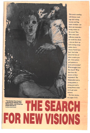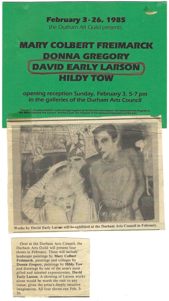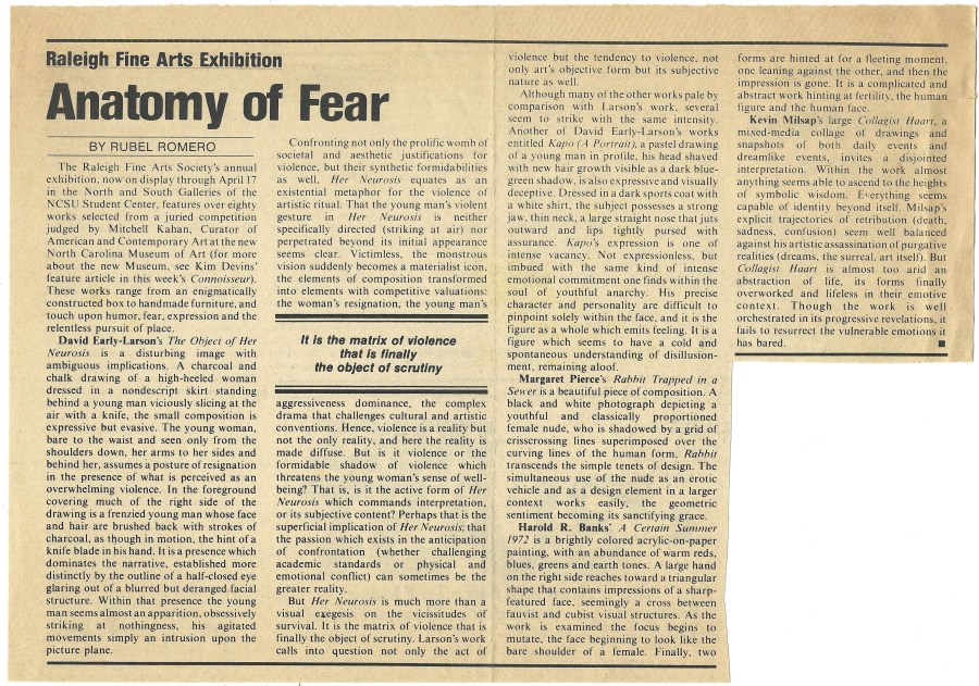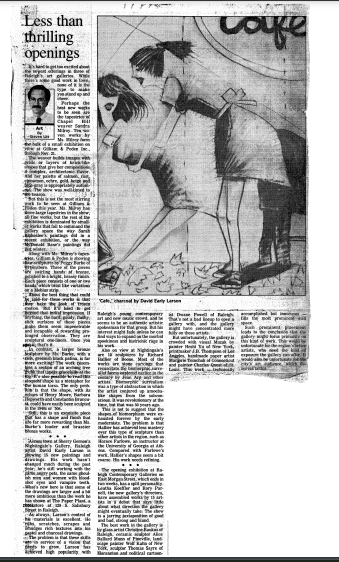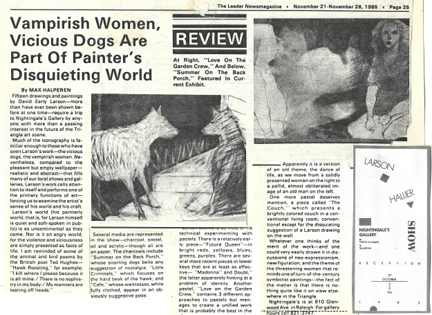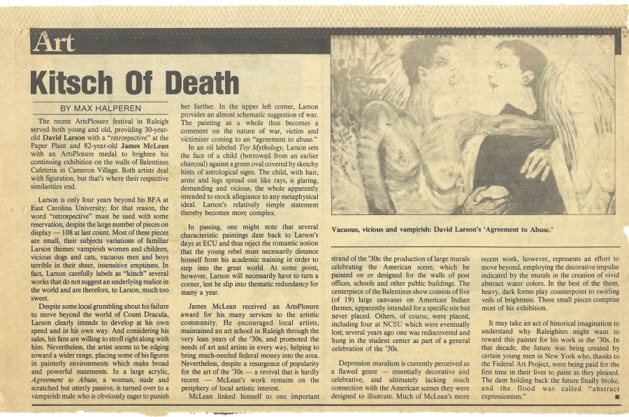 Larson’s world (this painterly world, that is, for Larson himself is quiet and soft-spoken in public) is as unsentimental as they come. Nor is it an angry world, for the violence and viciousness are simply presented as facts of life…The fact of the matter is there is nothing quite like it on view elsewhere in the Triangle.