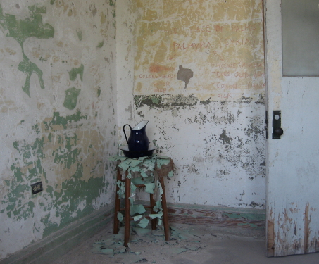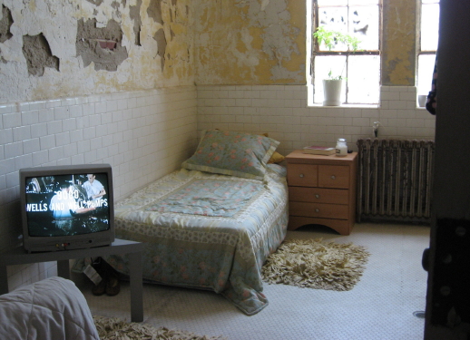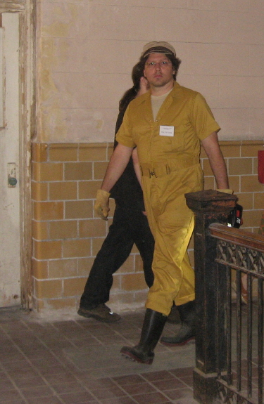 The apartment living space recreated so convincingly by Lia Newman was the scene of one of my most interesting verbal exchanges at Bain. The volunteer pictured above explained the apartment room by saying two Bain workers had to be on site at all time, in case of an emergency with the non-automated equipment. On asking Lia about it, she said she knew nothing of that. Was Ty putting on an amazing feat of performance art, or telling the truth – or both? A baneful mystery!