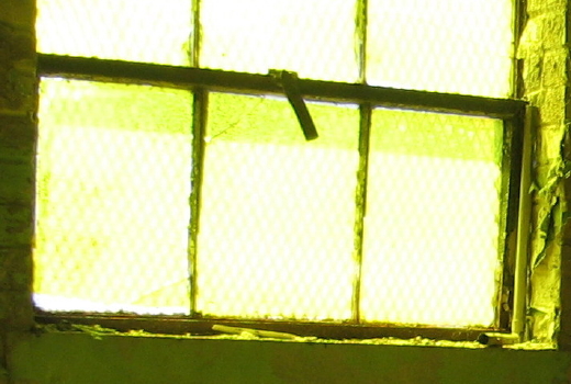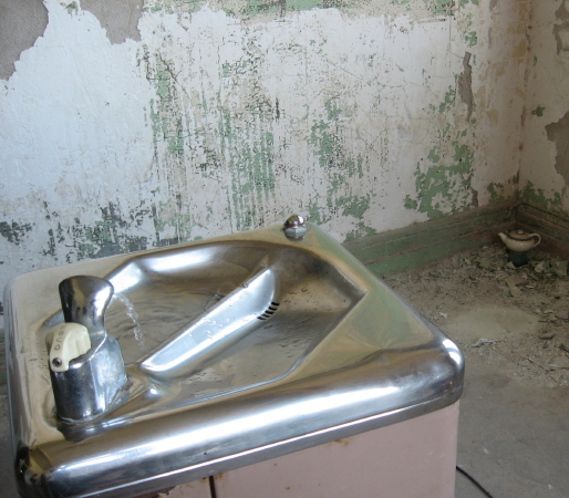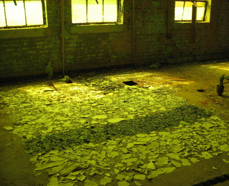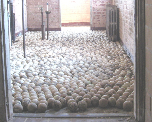 The row of large tanks, whose top openings are level with the floor, were a bit inscrutable. The symmetry and repetitions of the structures in this largest and least decayed room had a very calming effect. You might start discovering side rooms, or perhaps take the narrow central staircase down to the lowest level with huge pipes and valves, and then back all the way up to the small fourth story level with huge wooden cisterns and a nice view of the acres of outside water storage tanks surrounded by Piedmont meadow. Wherever you go, you see various artistic treatments of the unpolished porcelain balls that constituted the largest aggregrate of the Bain facility’s geological filtration system.