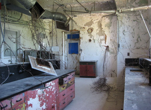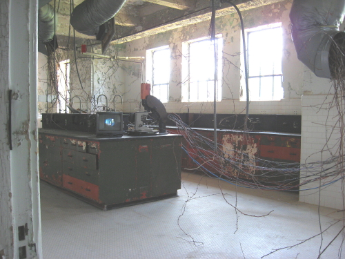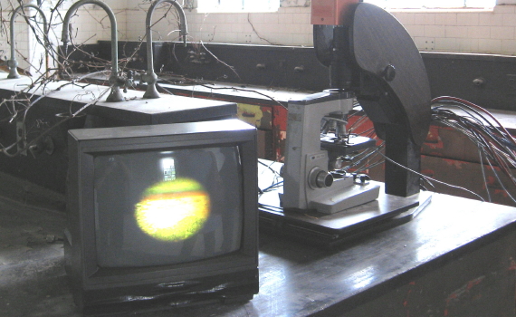 Tim Kiernan’s lab room was a big highlight of my second Saturday visit with Clyde. The helpful volunteer in the gold jumpsuit (who frequently banged around on the equipment in his rounds) got Tim to come up and show us around, and he even let me use the piece of Bain lab equipment that helped take the microscope picture above. The circular lense was used by Tim in his video for the lab installation. The lab was a fantasial mix of techology muscle and natural encroachment, with Tim’s vine additions blending perfectly with the vines actually coming in through the windows.