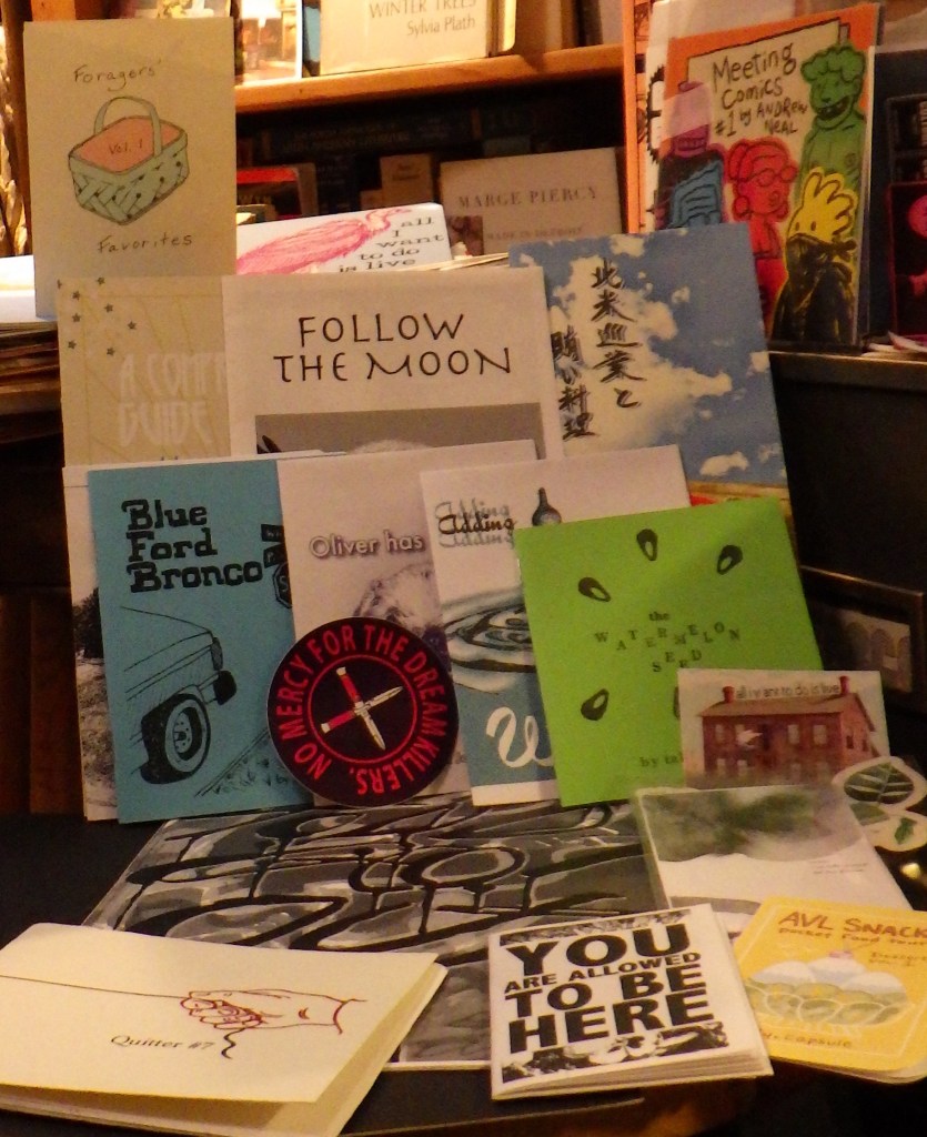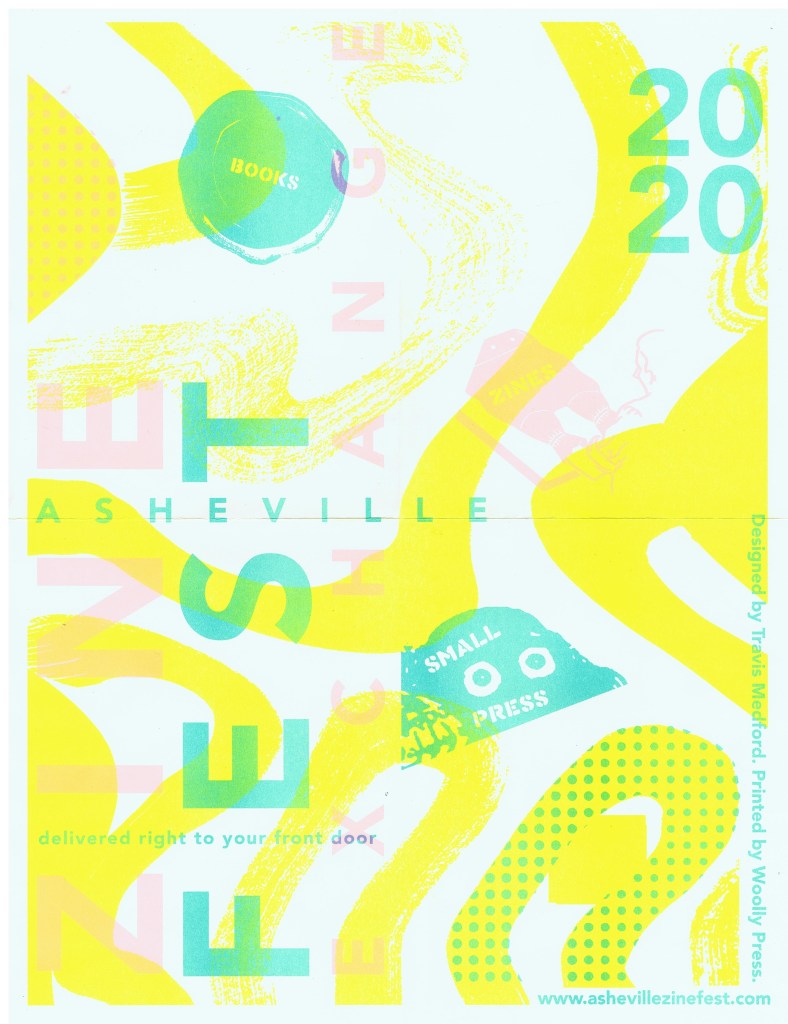 The packet I received contained a predictably wild variety of graphic designs and content. The organizers used the now-closed Asheville Bookworks as headquarters, and Laurie Corral, Jessica Smith and Mica Mead and Colin Sutherland of Woolly Press, a west Asheville publisher and risograph shop, worked to make this happen. I enjoyed all the entries, particularly Laurie’s risograph project “Forager’s Favorites,” and a wonderful textless mini-comic by Carrboro artist Julia Gootzeit called “B-Sides.”