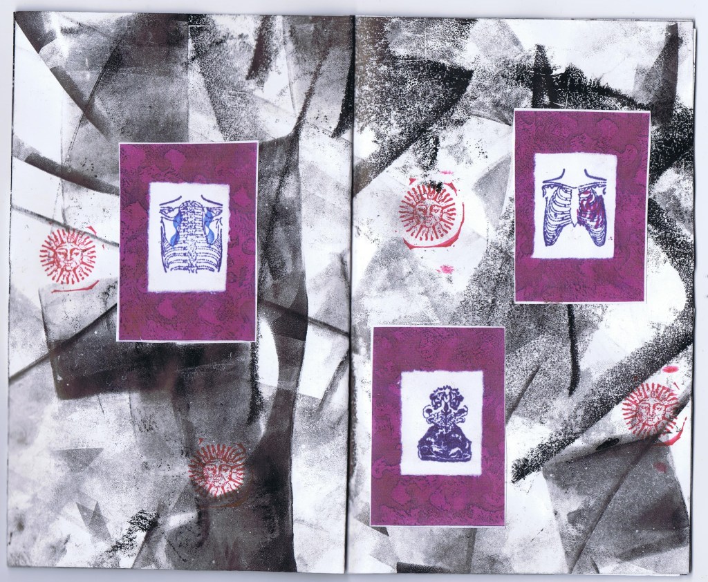 Plague Daze started as a mail art project sent out on May 1, 2020. Rubber stamping was the primary means of making images, with collaging of hand-laid paper some monoprinted and marbled. The poster version I created featured a collage and marbled version of the “40 days” concept from the mail art piece. That image, along with the art of guest artists, was color photocopied and then cut out and glued on to the background pages. Those pages are my secret ingredient for this zine. In printing covers for my book, The Natural History of Raleigh,” I set aside a ream of 11×17 copier paper to use in clean-up. The excess ink was removed with these, leaving strategic marks of the curved platen, the brayer marks, and various accidents of the cleaning motions. I collected over 200 of these and when the call for a zine came, I knew these were the perfect background for some pandemic content! Enjoy the contents of my zine below, and be safe!