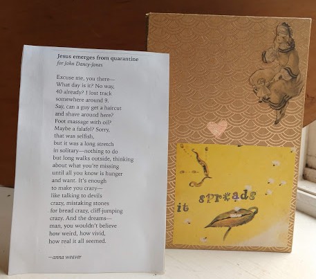 Two friends sent creative responses to Plague Daze, my mail art project of May 1. Mary Hill sent an exquisite collage folder, and Anna Weaver sent an original poem responding to the ideas in my mail art. These pieces arrived the same day, and immediately my gratefulness turned to amazement, because my shared message of thanks introduced them, and each has a strong connection to 309 W. Martin Street in Raleigh, home of The Paper Plant.