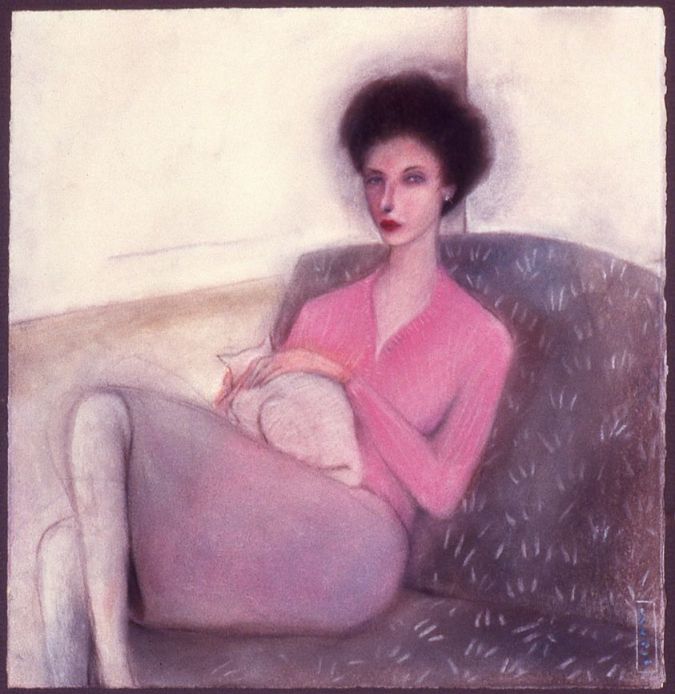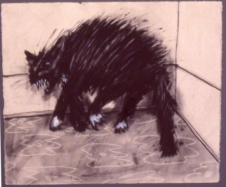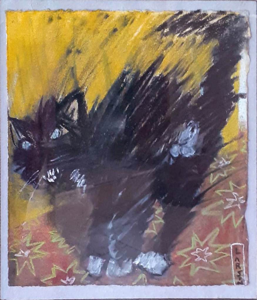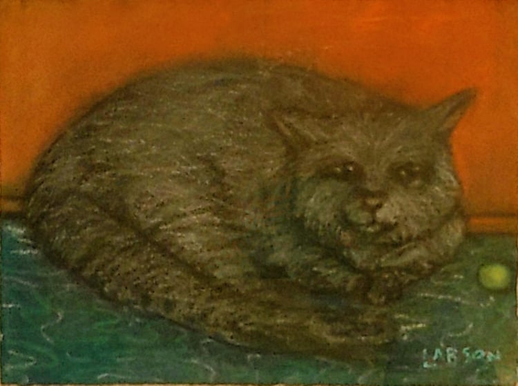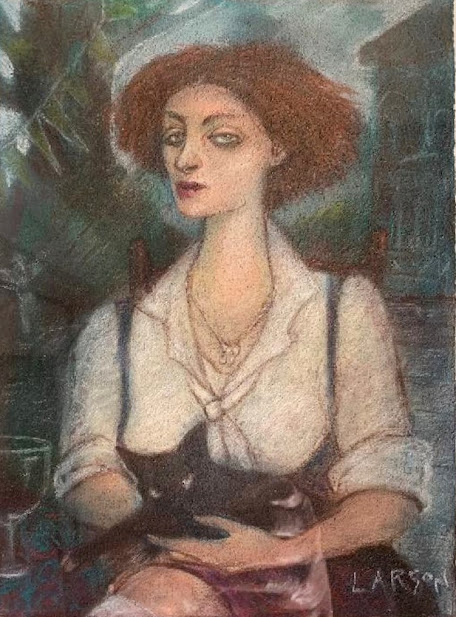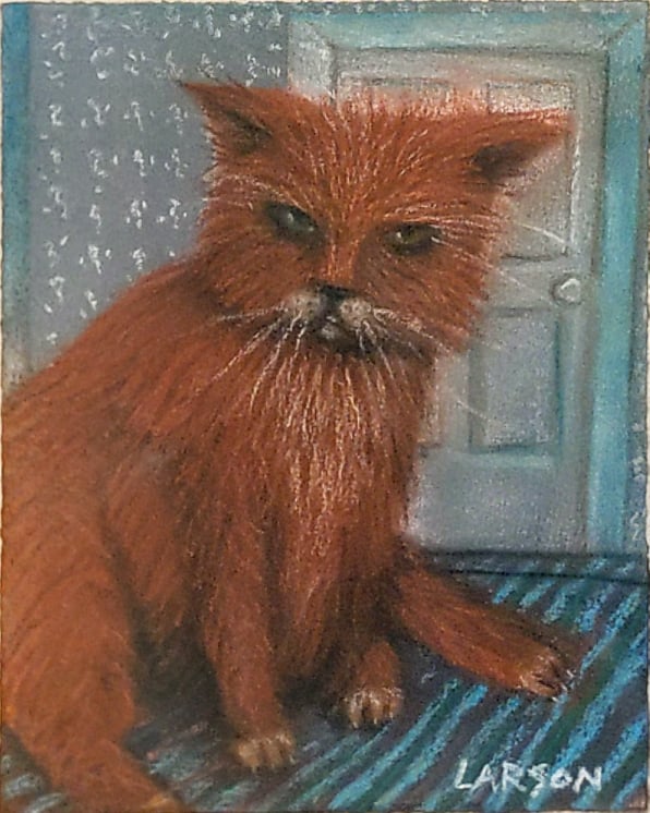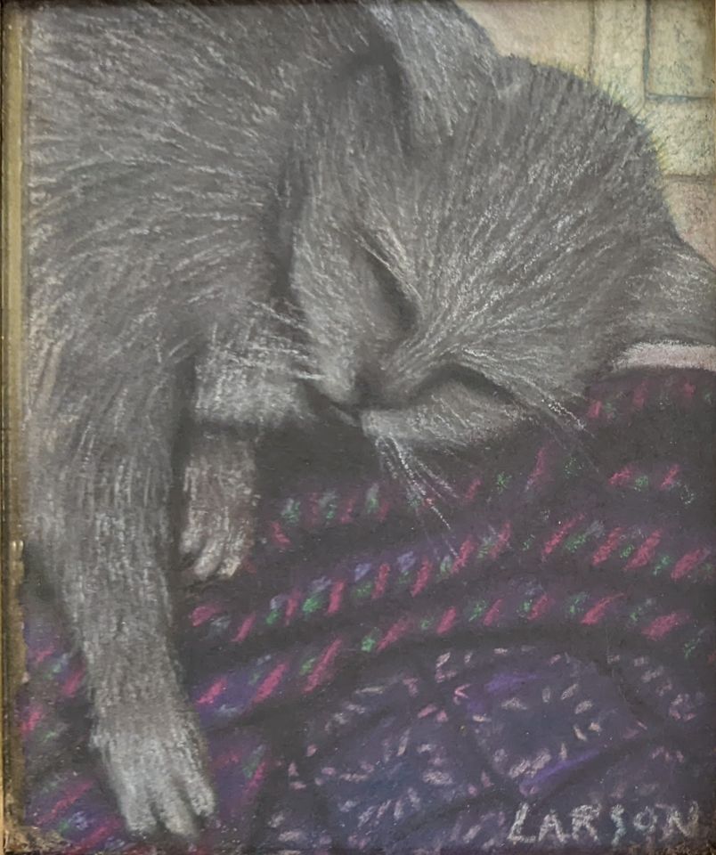 A last David Larson pastel from a slide that I missed posting. Kneaded erasure was used as a tool on the carpet pattern probably done in charcoal. It also puts this upset cornered cat in the smear series using it to accent the upturned fur in the moment of action. Alan Bowling, de facto executor of David’s art estate.