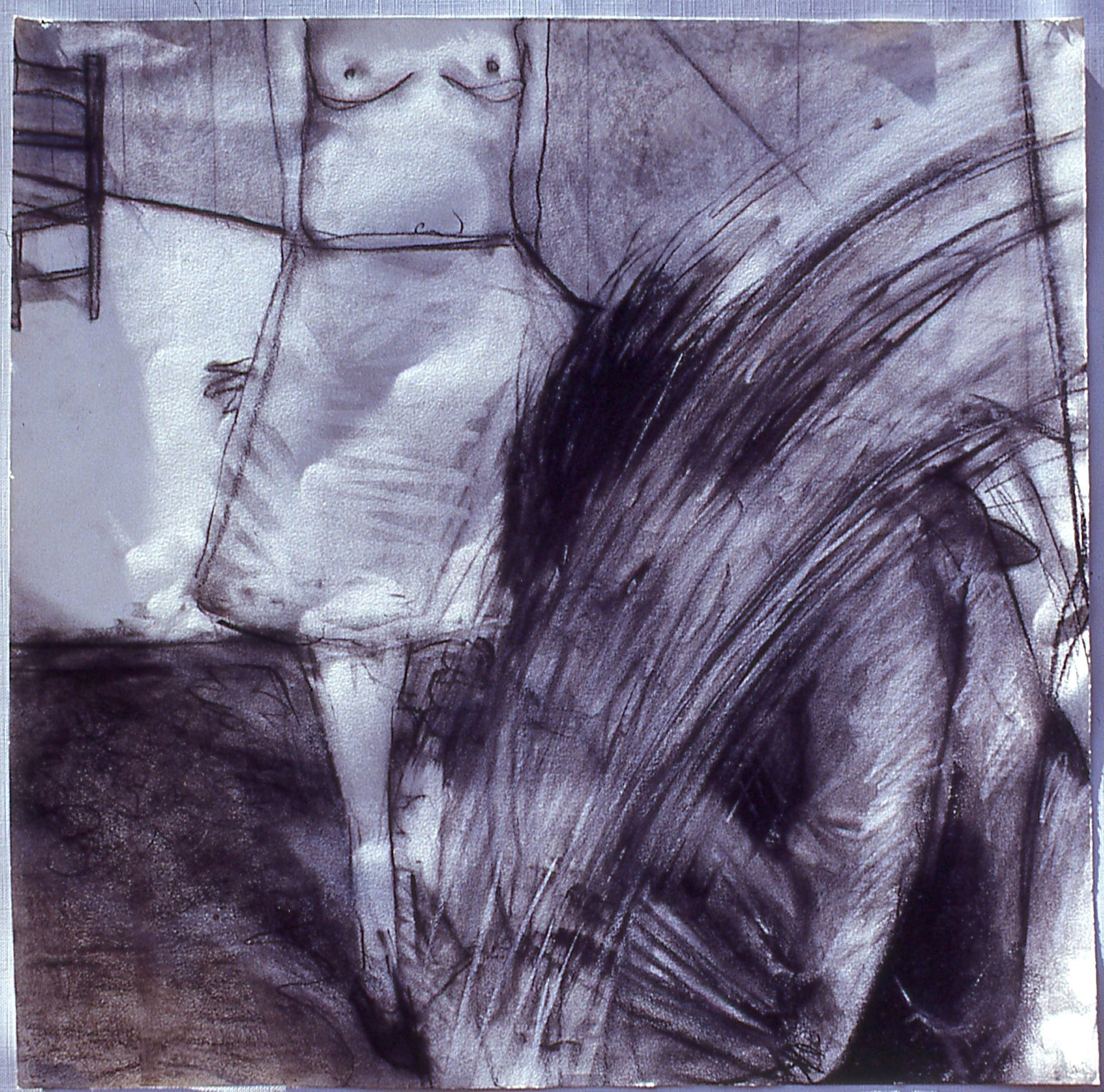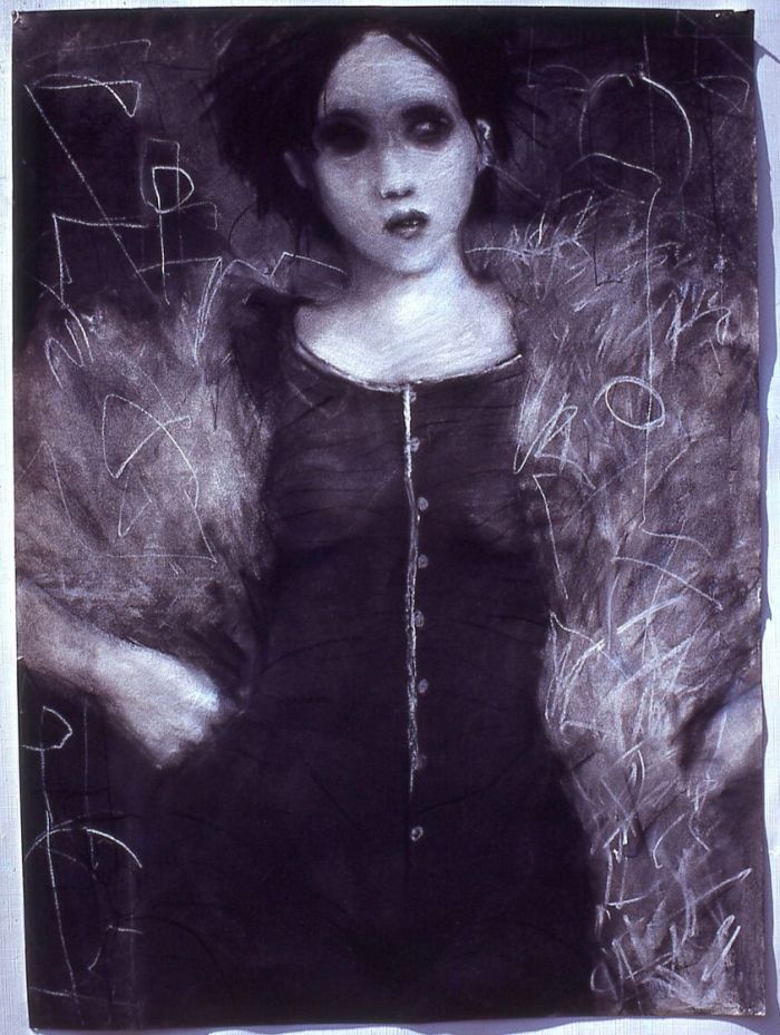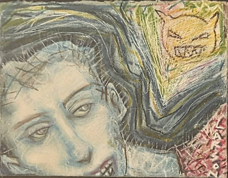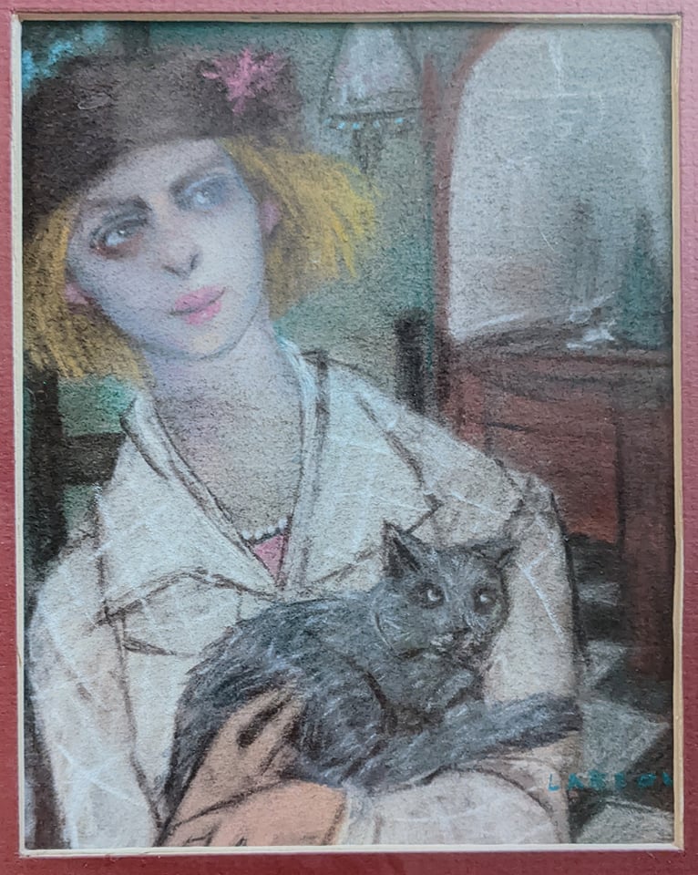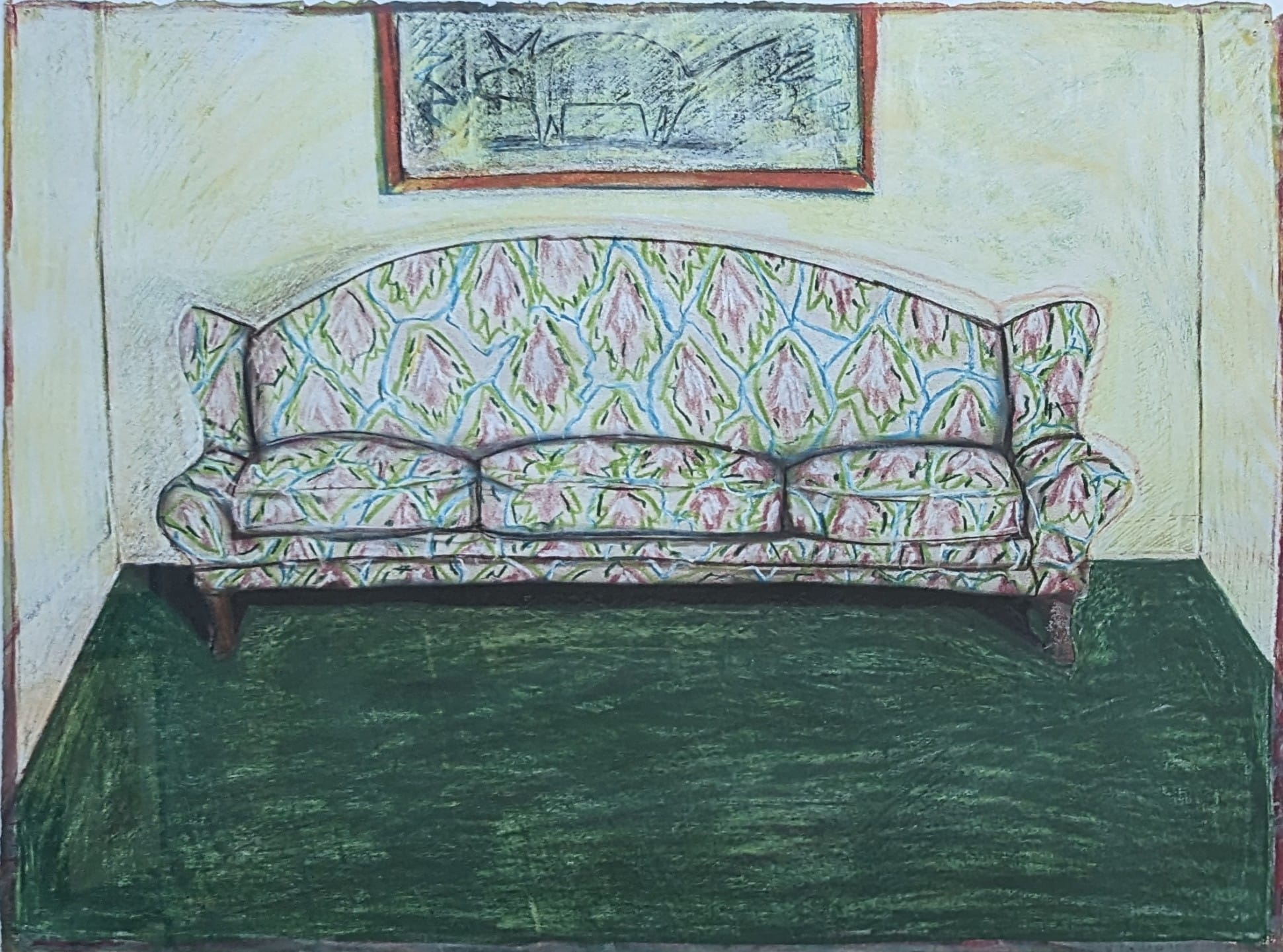A last David Larson pastel from a slide that I missed posting. Kneaded erasure was used as a tool on the carpet pattern probably done in charcoal. It also puts this upset cornered cat in the smear series using it to accent the upturned fur in the moment of action. Alan Bowling, de facto executor of David’s art estate.