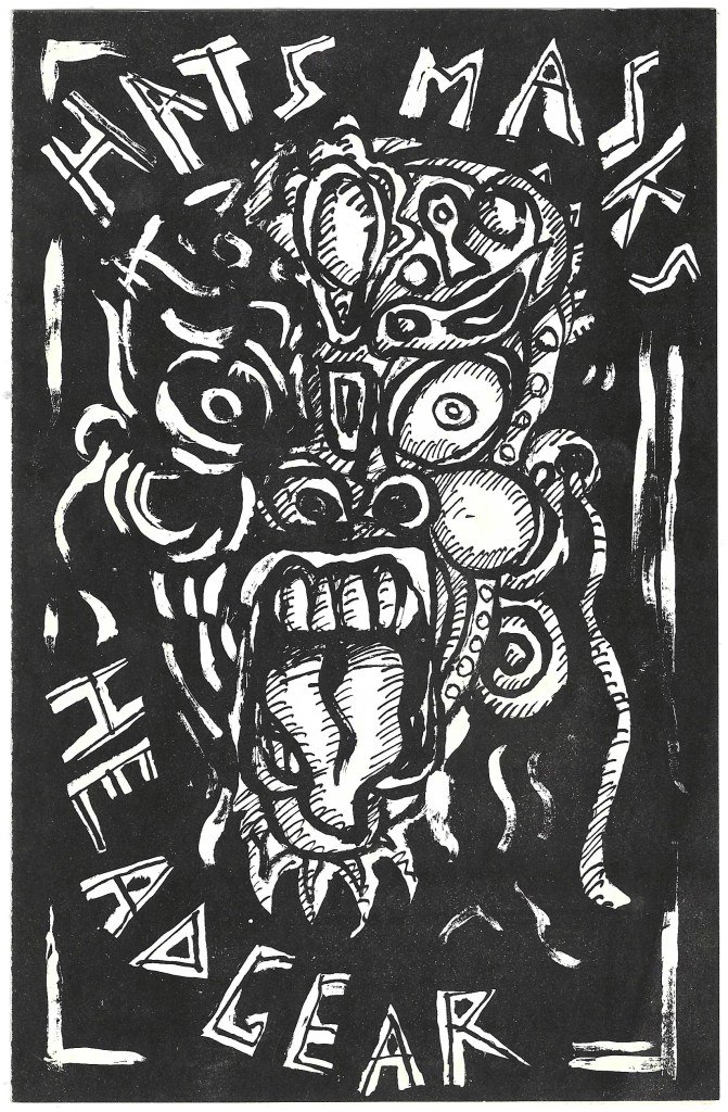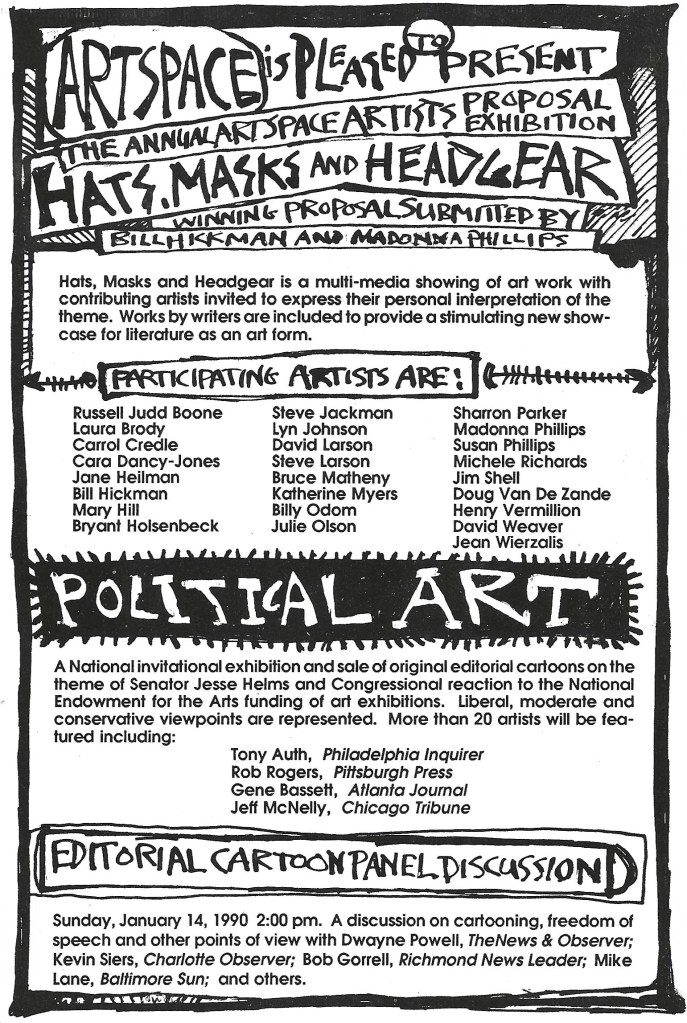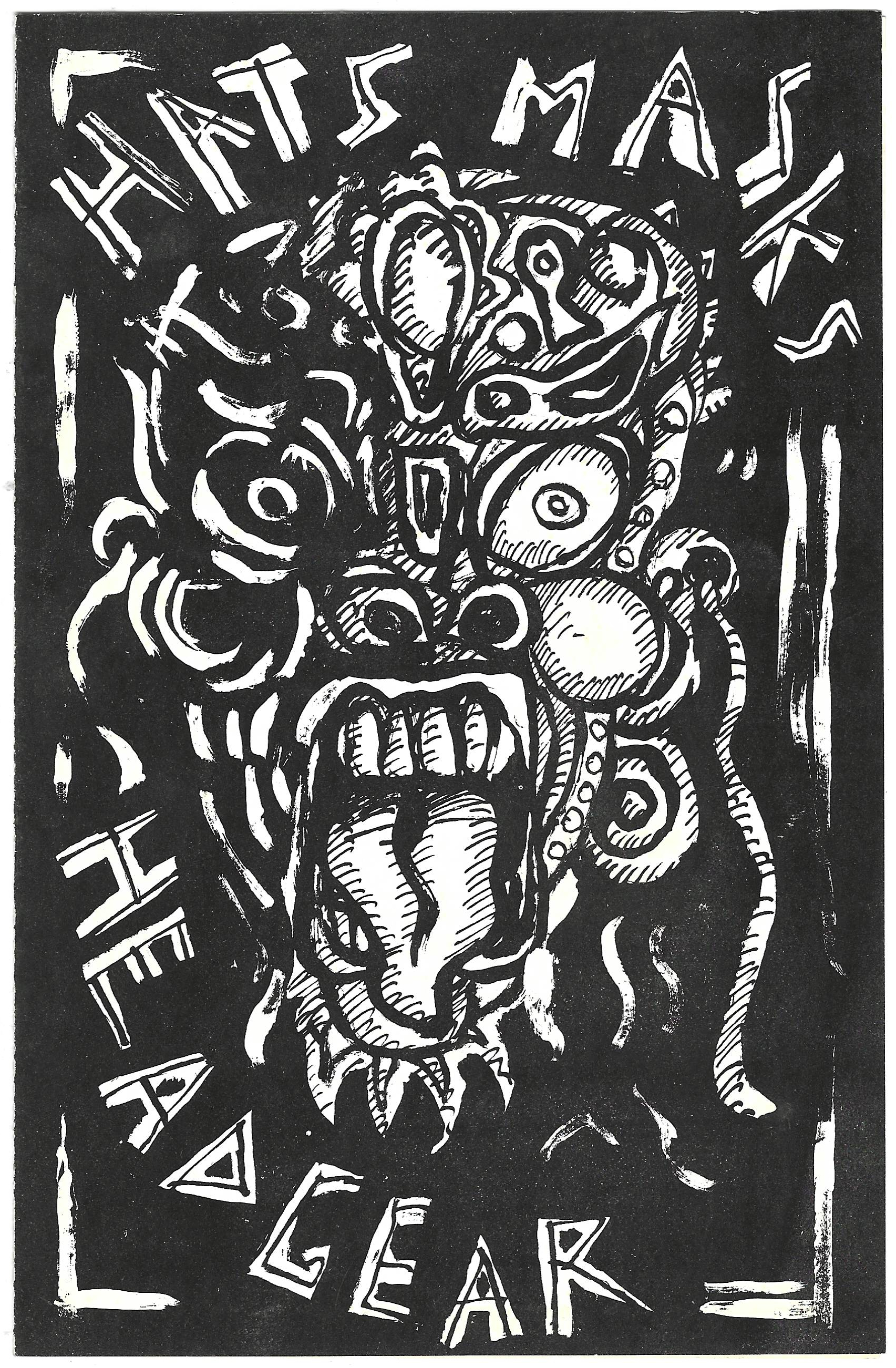 David illustrated and lettered a flyer for the Artspace show Hats, Masks & Headgear. The exhibition involved several friends of David who had formed a weekly writing workshop.