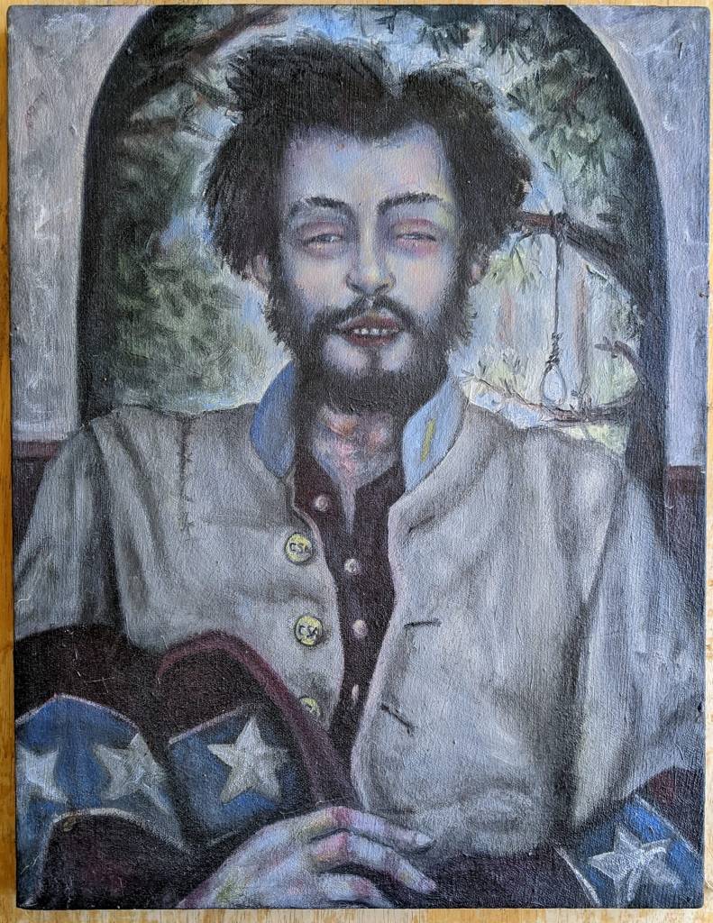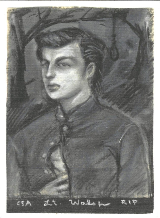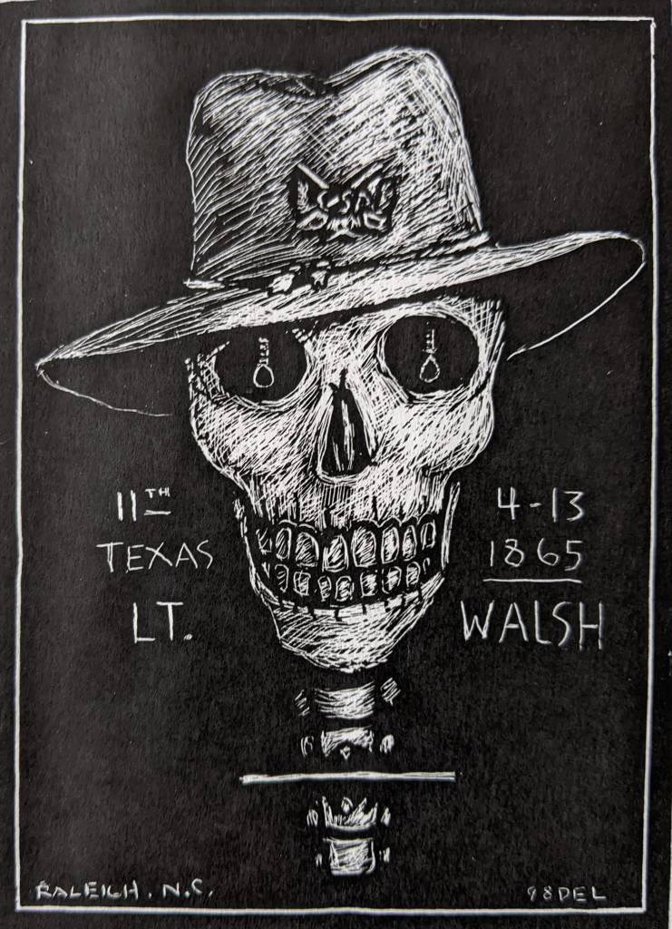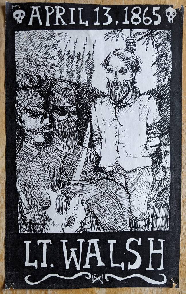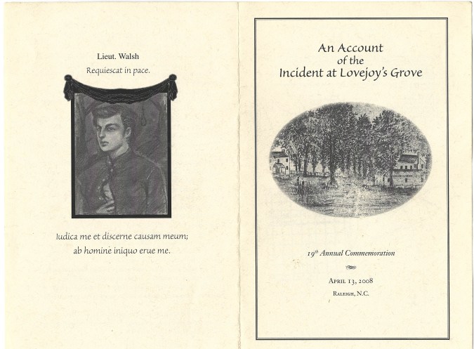 Lt Walsh was a Confederate soldier who, perhaps in a drunken angry mood, fired on the delegation of Union officers entering Raleigh to accept the city’s surrender. He was captured and hung at a spot in Oakwood near the Side Street Cafe. His grave is prominent in Oakwood Cemetery, and Karl Larson, a fervent local historian, made adorning his grave a special and sometimes large event every April 13th for over 25 years. David’s portrait was used in the elaborate brochure made for year nineteen.