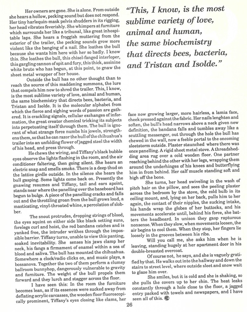 The past, though gone forever, can seem so real. Recognition and familiarity run like reinforcing wire through these stories. The past seems hazy but here the cliched futurism of science fiction is reversed and the past makes the content so real through the tangible details of memory. The past is all the content any of us have, when you think about it. Most of the stories end in an unrealized present that is left in your, the reader’s hands, to make of it what you will- armed, perhaps, with the newly discovered possibilities that have just emerged from the story’s view of the past.