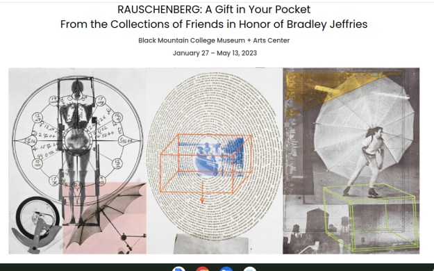 The Black Mountain College Museum + Art Center is hosting a traveling exhibit of a special set of work by Robert Rauschenberg – gifts, many made just for her, to his studio manager and confidant of 30 years, Bradley Jeffries. It’s an outstanding show with an initial grouping that is one of the most sensually beautiful I have ever seen in this or any museum. A good range of different media from this most versatile artist is shown, but a predominant one is solvent transfer, which captures pre-existing images, from text to photos to anything, in a dreamy and bluish hued tone of nostalgia.