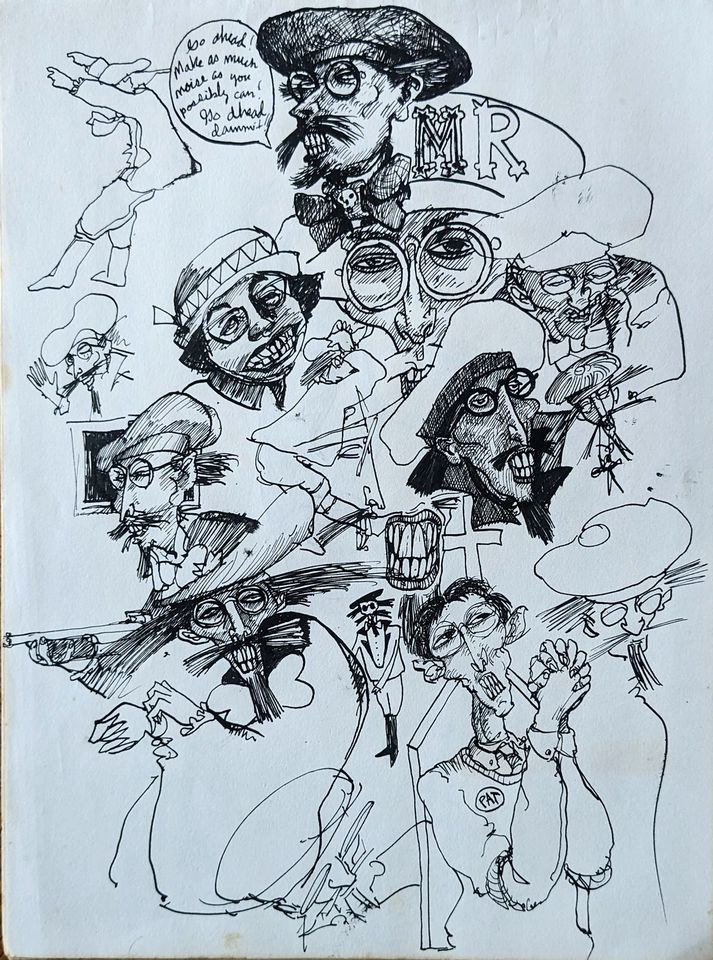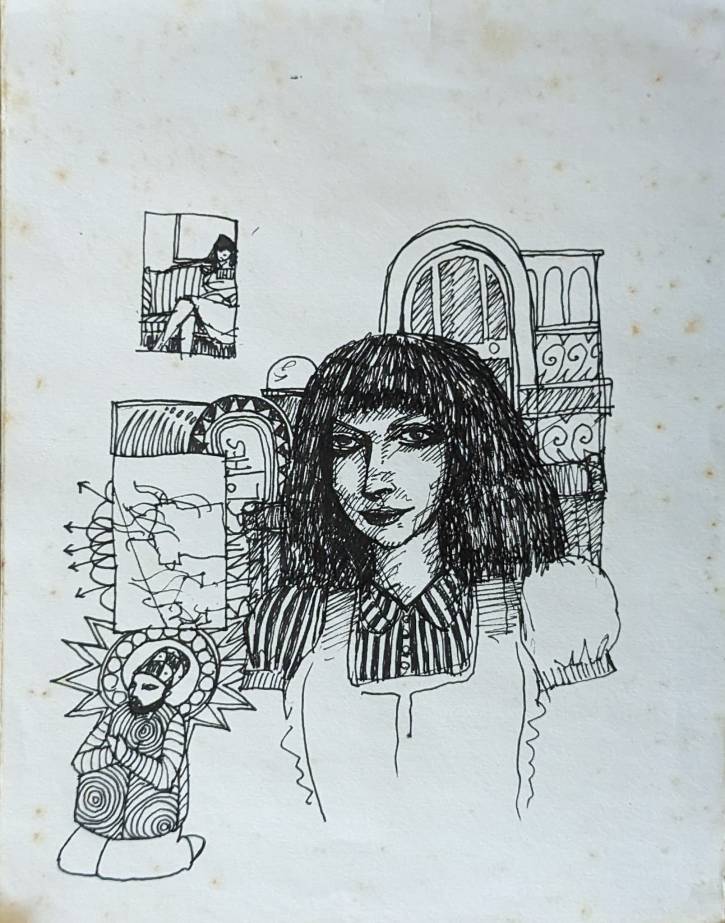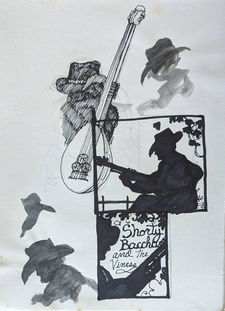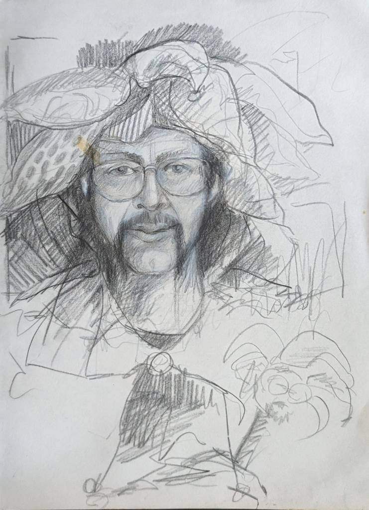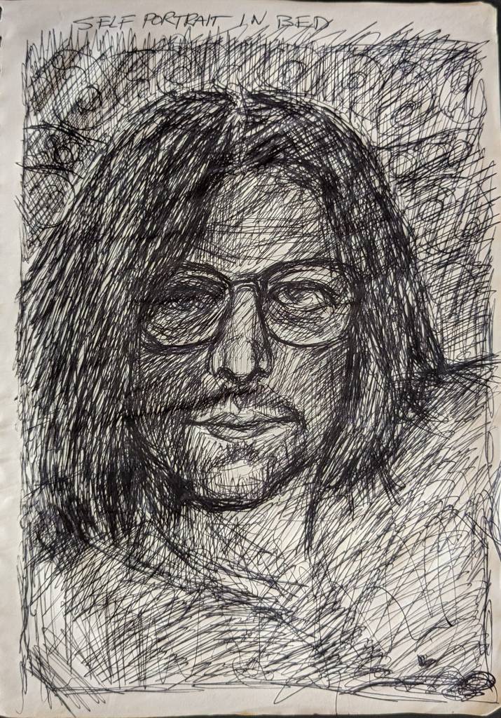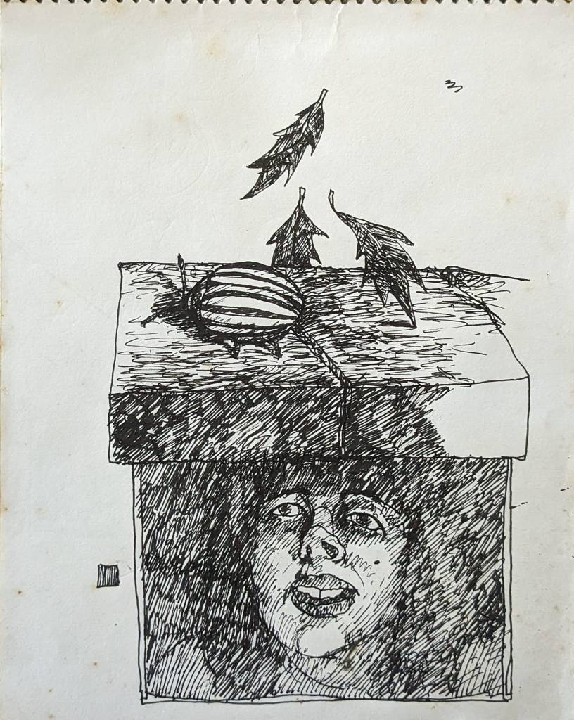 Alan B., the de facto steward of David Larson’s artistic estate, has put many hours into going through the pile of David’s notebooks at the Sasser Street home and putting up interesting images on the DEL Art Facebook page. Here is a selection of the best of those, featuring self-portraits, friends, drafts for finished works, the origins of the Duds, and some mighty wild and entertaining ideas.