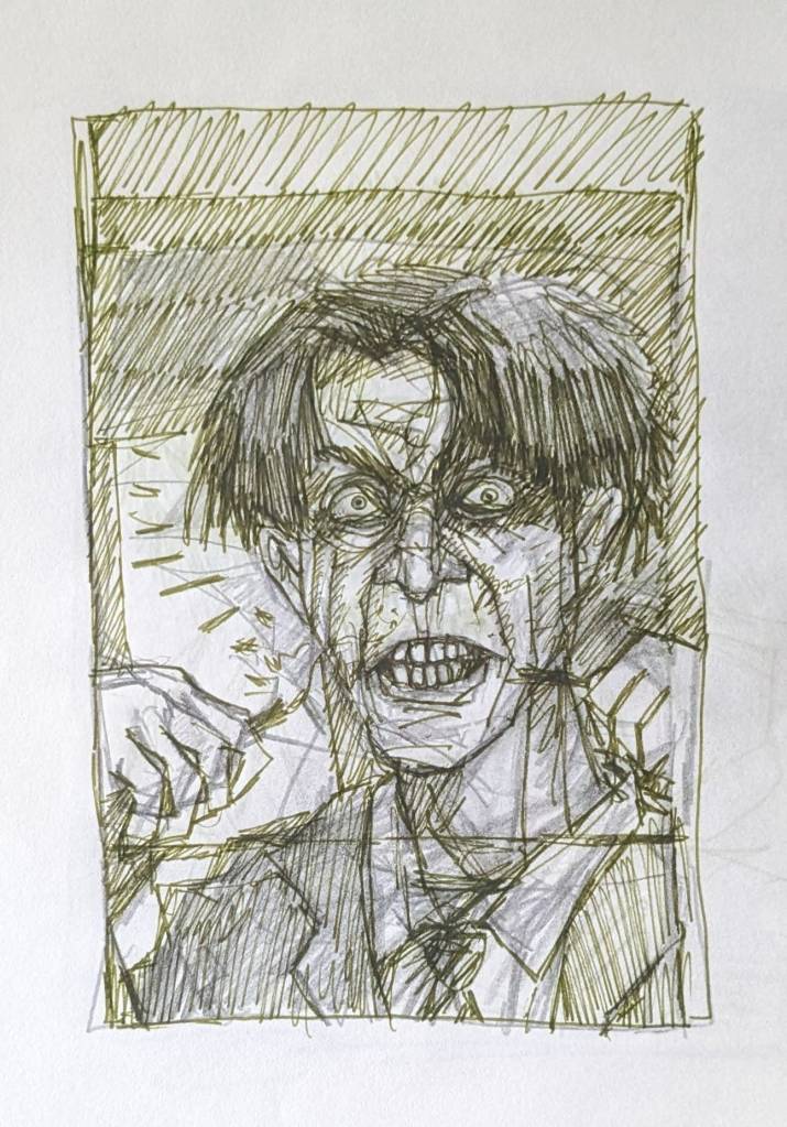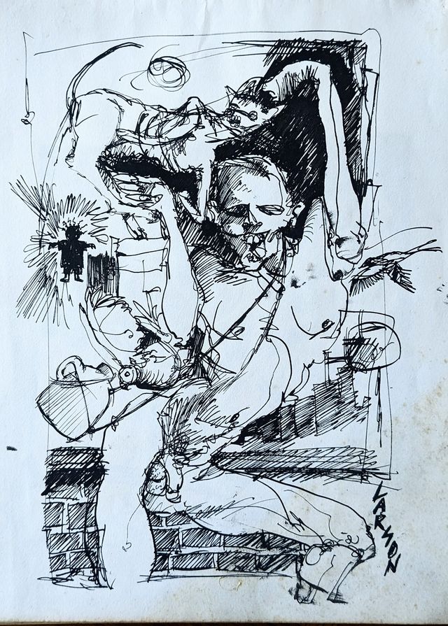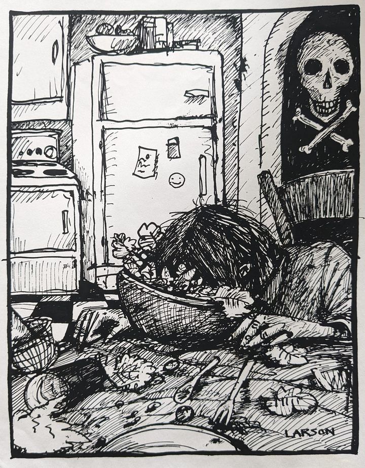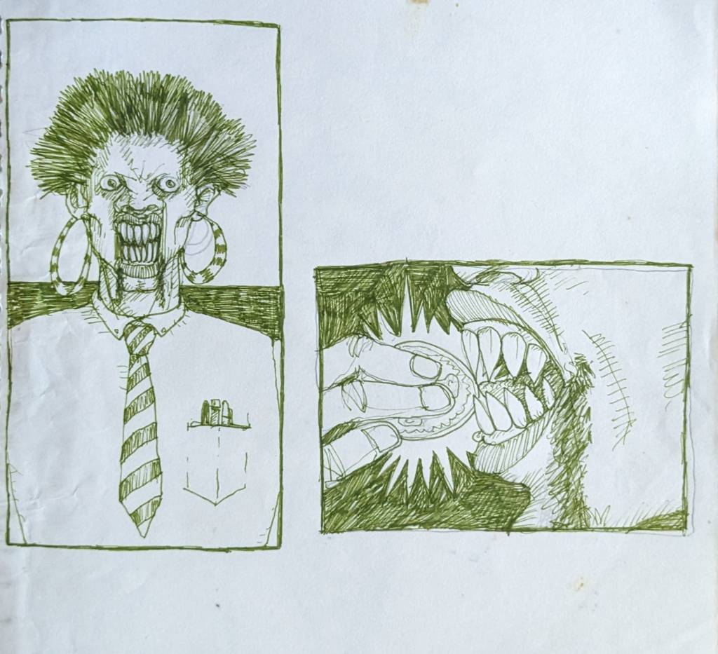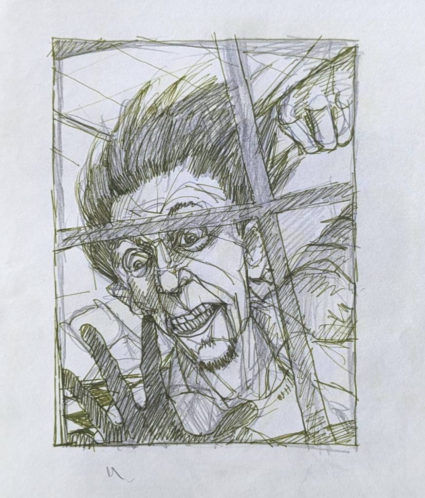 Alan B., the de facto steward of David Larson’s artistic estate, has put many hours into going through the pile of David’s notebooks at the Sasser Street home and putting up interesting images on the DEL Art Facebook page. Here is a selection of the best of those, featuring self-portraits, friends, drafts for finished works, the origins of the Duds, and some mighty wild and entertaining ideas.