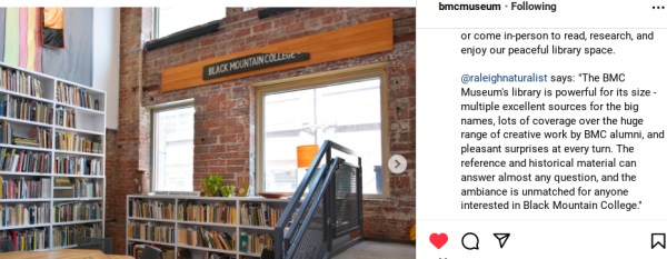 The Black Mountain College Museum + Art Center in Asheville has become ever more dear to my heart as I have developed a retirement habit of spending time most weeks in its library as well as that of the Center for Craft and the special collections room of Pack Library. The BMCM+AC staff used a quote from me to promote the library: