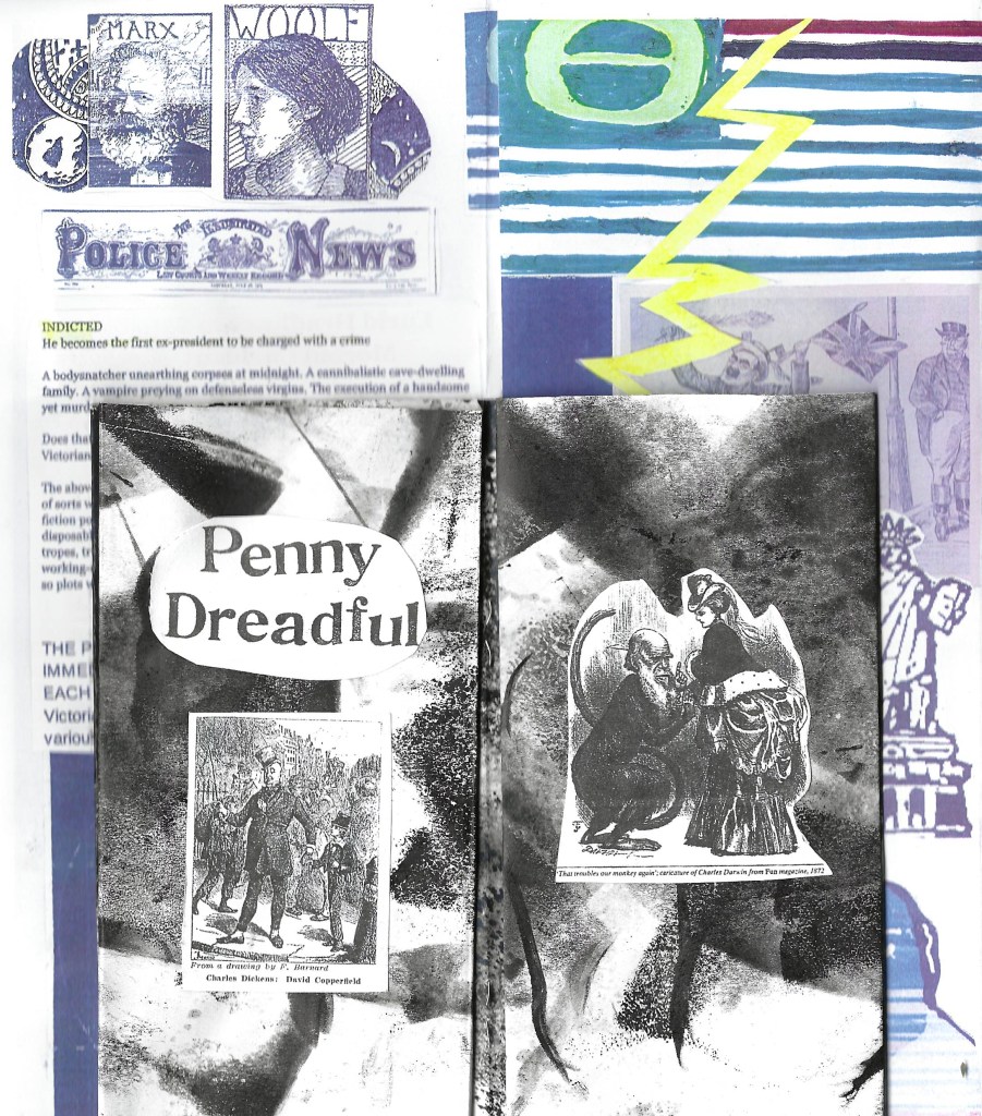 Historic images of Penny Dreadful covers and other historical print images (occasionally modified) were cut out and glued into the booklet. Over 3000 pieces! Not all are shown.