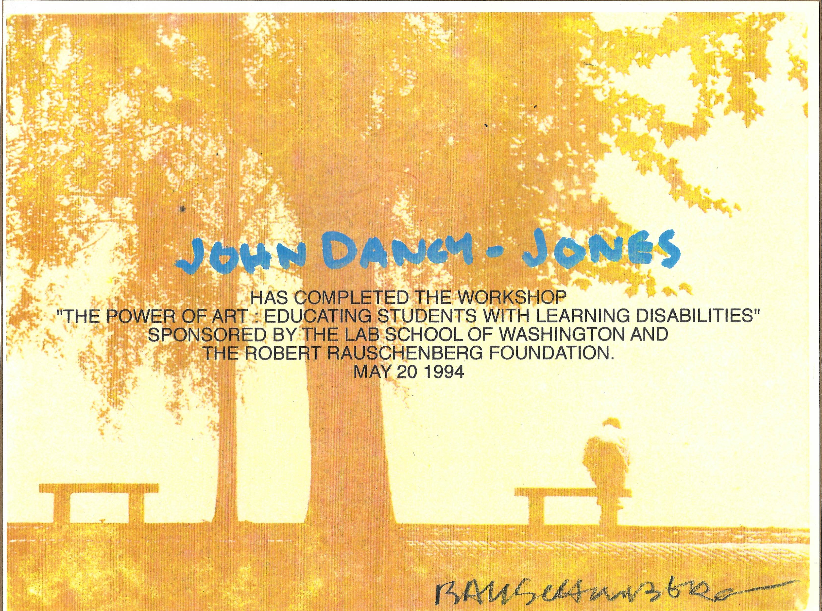 Robert Rauschenberg found out as an adult that he had a learning disability ( as distinguished from being what he thought was “stupid”) from Sally Smith, founder of The Lab School. He became a supporter of the school, and the “Power of Art” program, of which I was a charter participant, rewarded art teachers who worked with that that population. Mr Rauschenberg treated us to a presentation along with his assistant, gave us signed posters, a five hundred dollar gift certificate to Jerry’s Artarama,and sat and listened to each of us present about our work. That evening, we were feted at a private reception at the National Gallery’s East Wing, and Mr Rauschenberg favored us with a tour of his own work on the walls. He discussed his decision to create the “white painting” while at Black Mountain (Josef Albers thought it a needless extreme), and he gave a vivid description of painting the huge 25 foot work which was on display in the main room -smearing his hands with the white lead paint for hours and then having to go into immediate treatment for weeks because of the lead poisoning. He was charming and down-to-earth, yet fragile and a bit ethereal in his personal presence. That was a wonderful day.