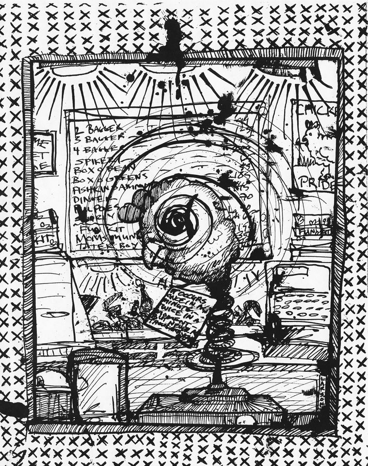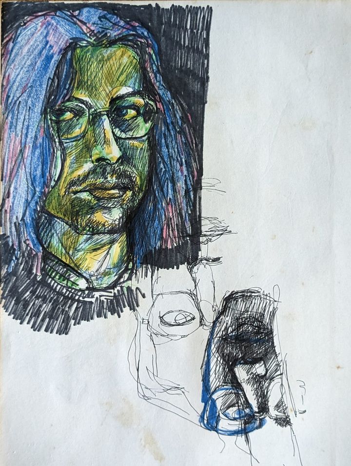 Alan B., the de facto steward of David Larson’s artistic estate, has put many hours into going through the pile of David’s notebooks at the Sasser Street home and putting up interesting images on the DEL Art Facebook page. Here is a selection of the best of those, featuring self-portraits, friends, drafts for finished works, the origins of the Duds, and some mighty wild and entertaining ideas.