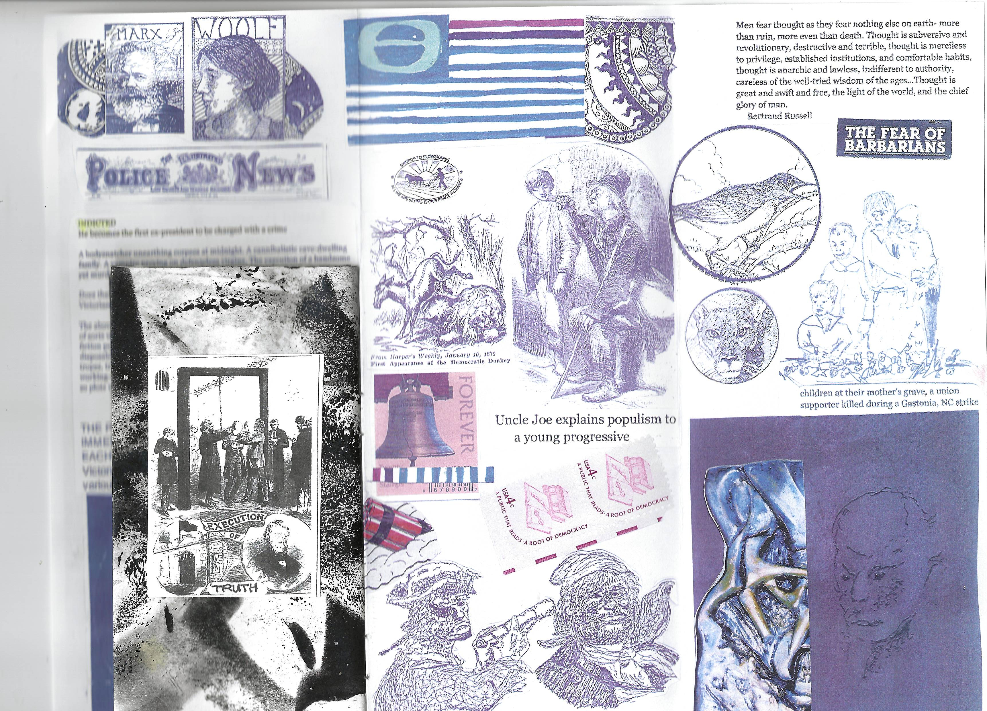 My latest and biggest ever mail art is out in the world in an edition of 120! Based on an early form of street literature I learned about from Dr. Charles Edge at UNC-CH in the early 70’s. I previously used the format in a self-publishing project with 6th graders at Glenwood Elementary my final year in Chapel Hill. Sent one year from an inauguration that will be a watershed for our country – one way or the other.