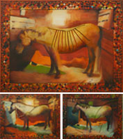 Susan Toplikar has a magnificent, career-capping show at Meredith. The link will take you to a sumptuous color online brochure (pdf), which includes extensive statements by Susan, the curator and another artist/writer. Six major oil works comprise a series that explores multiple levels across each of the fundamentally similar pieces. The horse images derive partly from Susan’s experiences of the cave paintings of France’s Dordogne Valley. The harlequin pattern that borders each piece derives from ceramic tiles she saw in Avignon on the same trip. The painted sticks which so exquisitely insert themselves into the oil paintings “reference a part of the horse’s anatomy or [alternatively] the role of the horse in our collective history.” There is a wonderful interplay of themes and techniques, but the real reason to go see this show is simply to enjoy the fusion of skill and emotion in Susan’s gorgeous oil paintings on linen. The horses evoke the archetypal Ole Paint of our cowboy dreams, visioned in the smoky memories of cave art, and framed with elements that help bridge the eons. These horses will move you!