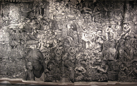 Artspace has a very strong show in its main gallery. It certainly isn’t a broad show, with just six artists, but each type of work has its own area of the room, and these are large scale pieces with highly varied techniques, so they need it. Largest of all is the fantastically huge patched-together woodcut print by the team of Martin Mazorra and Mike Houston, aka Cannonball Press.