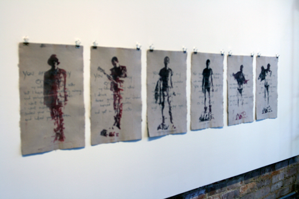 The media installation by Sherri Lynn Wood, seen on the right wall above, was interactive in a way that emblemized the reach this program had into the community. Spectators were invited to use small printed forms to share their own slogan in response to the video, which featured repetitive phrases. The responses slowly filled the wall around the video screen throughout the show. You can see the video yourself at www.mantratrailer.com.