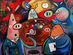 Starting at Artspace as usual, I stopped by the front gallery to see Keith Norval’s opening of The Corporate Art Show. Keith has outdone himself in the wake of his new parenthood, along with the talented Ann Podris. Keith’s quirky rendering of goofy cartoon images with surprisingly subtle oil color and brushwork may or may not be your favorite style, but you can’t miss these hilarious concoctions of Angry Squirrel Customer Service, Rhino Dollar Bills, and Pig Salt.