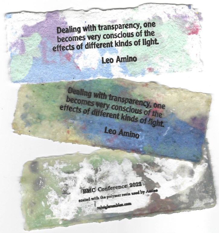 The 13th Black Mountain College conference called ReVIEWing features Leo Amino, of whom I had not heard before this event. He pioneered the use of polymer resins as the material for abstract sculpture. My annual BMC give-away is pictured above, with a book mark quote from Amino experimentally coated with polymer resin.