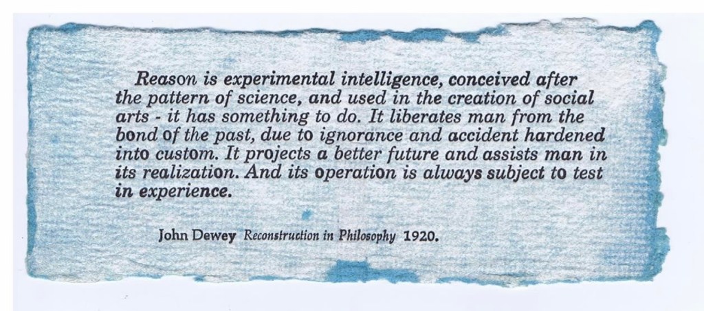 Above is the bookmark I will be giving away at the 9th Annual ReViewing BMC Conference. The quote from Dewey is appropriate for the work/technique/process theme detectable in this year’s offerings, and I’m really excited about going, but the printing of this quote is just as much about the new book published by Brian Butler, who is the UNC-A philosophy professor who helps run the BMCM+AC and who practically invented the wonderful annual conference. I have missed only two of the nine and been blessed with many new friendships through it, Brian not the least. Dewey, whose philosophy infused Black Mountain College, was an early pragmatist, as was Charles Pierce, someone I’ve tried to study over the years. Brian’s tangible and personable promotion of pragmatism, his willingness to interact with a layman such as myself, and reading his new book have given me a healthy dose of mental stimulation and a lot to ponder as we all face the task of finding a workable world view from which we can operate as a world community.