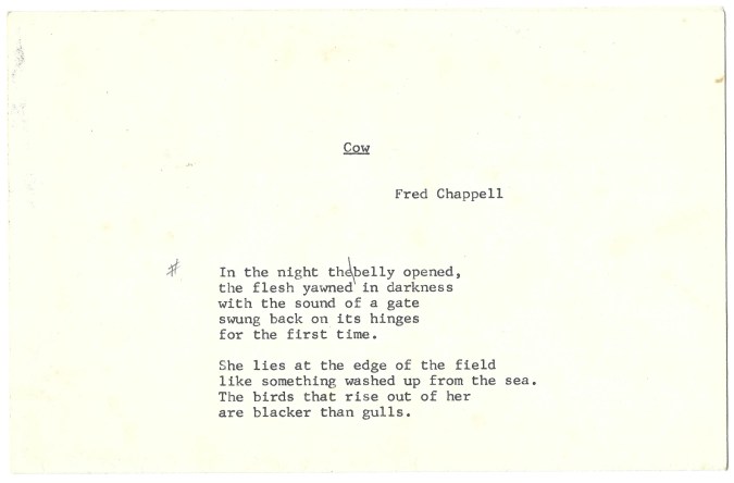 When I left Chapel Hill for Greensboro I was determined not to be a professor/writer-wannabee and was highly suspicious and dubious of university writing programs. But UNC-G is a small campus and I was soon active and prominent as a new papermaker and nebulous Creative, though the term did not exist in 1976. I became acquainted with the renowned Fred Chappell, and though I did not become his writing student, he read what I gave him and was kind and very helpful in chats and, later, letters. What a generous soul who celebrated life in some of the richest detail to be found in verse. He wrote the story of his life in rural Canton in poems that were like the richest bits of a short story. His actual fiction was wonderful but never became as well known. The first of his science fiction pieces was Dagon, and having read in an interview that he considered it readable in one sitting, and wrote it with that approach, I immediately did so and told him. He seemed tickled, but then Fred was always bubbling with some kind of energy. He was a learned man and intuitive teacher; he could sound out a human condition and reach out to it with an effortless good humor.
