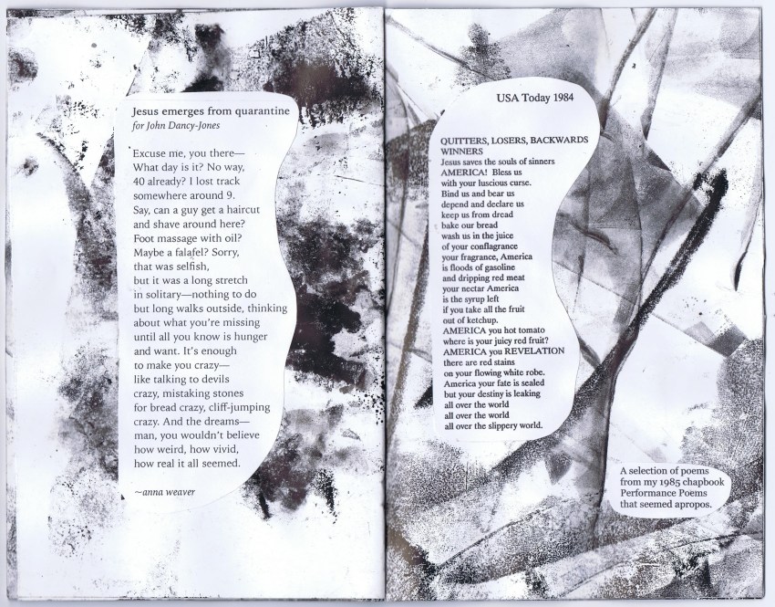 The format is a 2-sided color photocopy enclosing a small booklet made of an 11×17 sheet strategically used to clean off excess ink from the platen after letterpress printing nature book covers. I also used these for the zine version of my pandemic mail art piece, Plague Daze.