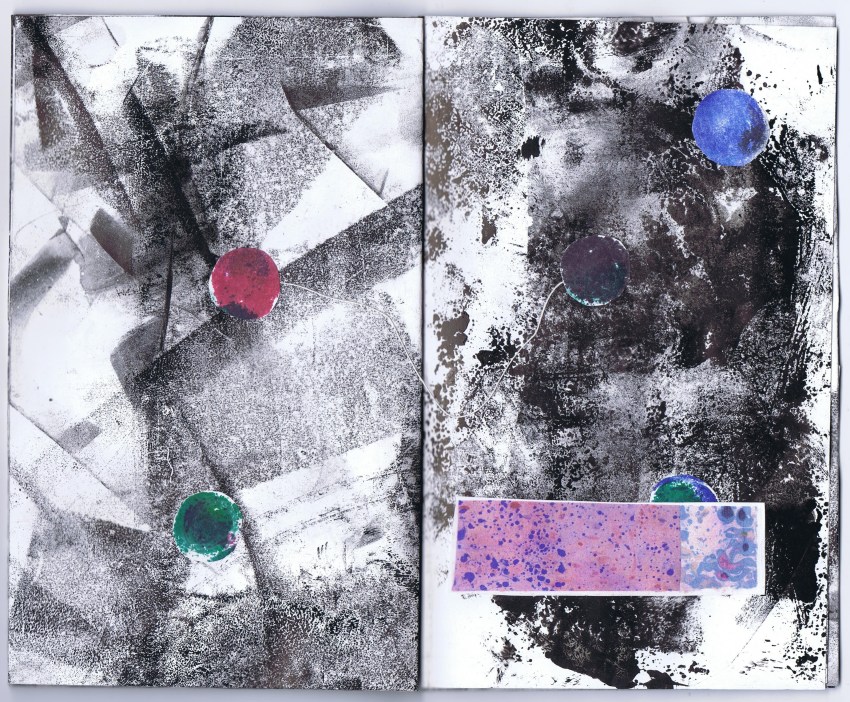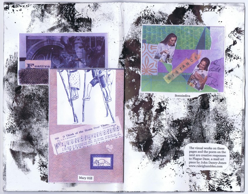 Plague Daze started as a mail art project sent out on May 1, 2020. Rubber stamping was the primary means of making images, with collaging of hand-laid paper some monoprinted and marbled. The poster version I created featured a collage and marbled version of the “40 days” concept from the mail art piece. That image, along with the art of guest artists, was color photocopied and then cut out and glued on to the background pages. Those pages are my secret ingredient for this zine. In printing covers for my book, The Natural History of Raleigh,” I set aside a ream of 11×17 copier paper to use in clean-up. The excess ink was removed with these, leaving strategic marks of the curved platen, the brayer marks, and various accidents of the cleaning motions. I collected over 200 of these and when the call for a zine came, I knew these were the perfect background for some pandemic content! Enjoy the contents of my zine below, and be safe!