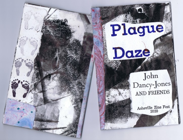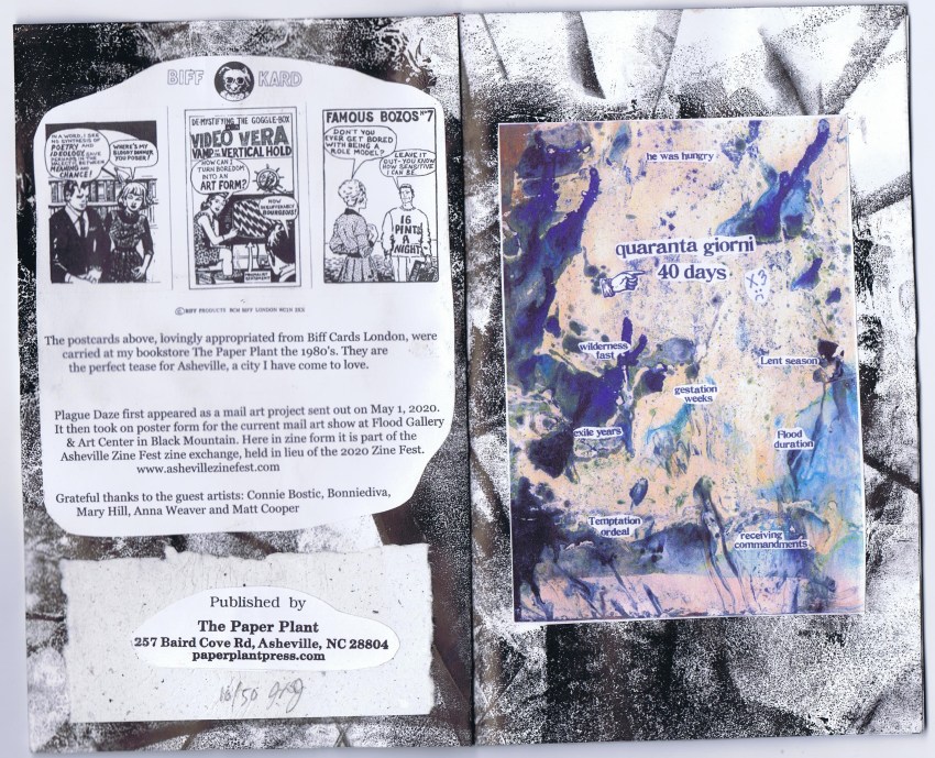 September 20th, 2020 marks the scheduled day for the Asheville Zine Fest, a long standing venue for the numerous micro-publishers in Asheville as well as zinsters across the state. The Paper Plant was set to participate, and I was very excited to network with other publishers and display the Paper Plant catalog at The Center for Craft in downtown Asheville. Alas, the event was cancelled but then replaced by a wonderful idea: a zine exchange among the publishers. That motivation pushed me to one last version of Plague Daze, the May 2020 mail art project that I also had converted to poster form for a mail art show at The Flood Gallery in Black Mountain. Above is the zine I created along with a spread of the zines I received in the exchange.