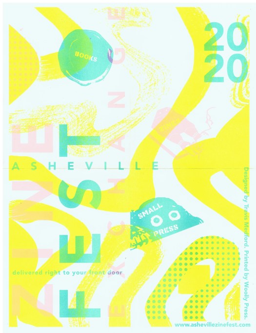 The packet I received contained a predictably wild variety of graphic designs and content. The organizers used the now-closed Asheville Bookworks as headquarters, and Laurie Corral, Jessica Smith and Mica Mead and Colin Sutherland of Woolly Press, a west Asheville publisher and risograph shop, worked to make this happen. I enjoyed all the entries, particularly Laurie’s risograph project “Forager’s Favorites,” and a wonderful textless mini-comic by Carrboro artist Julia Gootzeit called “B-Sides.”