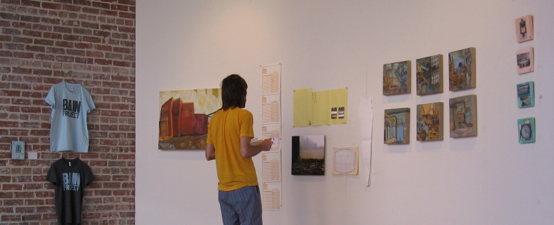 The evening music drew much larger crowds, but being generationally impaired, I spent most of my evening visit out in the front room with the Bain artists, who were rotating duties at the door, selling t-shirts and networking. There were small heavily layered iconic pieces from Marty Baird and Lee Moore, traditional oils from project leader Daniel Kelly, reflective collages on graph paper from Sarah Powers, a photo montage from Lia Newman, a piece of mail art from Stacey Kirby, and much more.