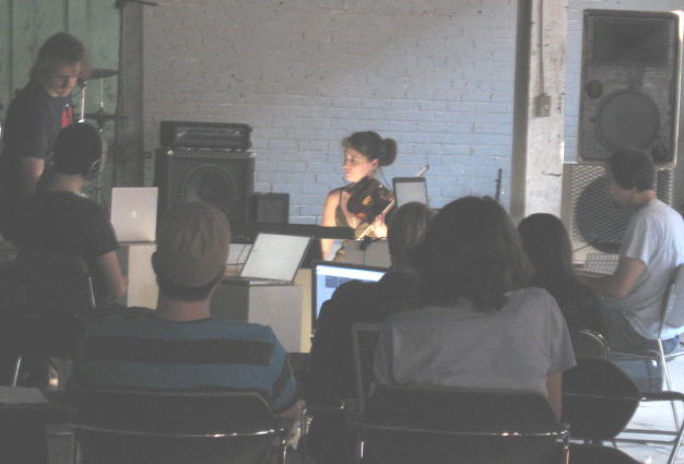 The big draw this weekend was the marathon music session, helpfully bannered at New Raleigh, which eventually drew a large evening crowd. The early afternoon acts were experimental and sparsely attended, but a truly amazing event took place at 4 PM. Benito Crawford, on the left below, devised and conducted a performance where the audience participated through a net interface. Crawford is a doctoral student in music at Duke, and the piece performed Saturday is part of his dissertation.