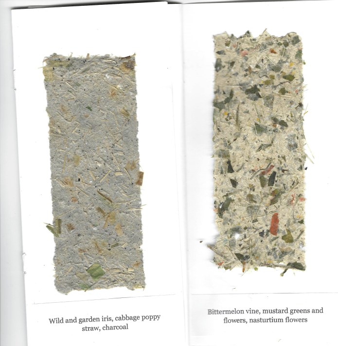 The materials from the list were combined with a small dose of grocery bag, cotton linter, and potato starch. Each sheet yielded 4 bookmark samples for the booklet.