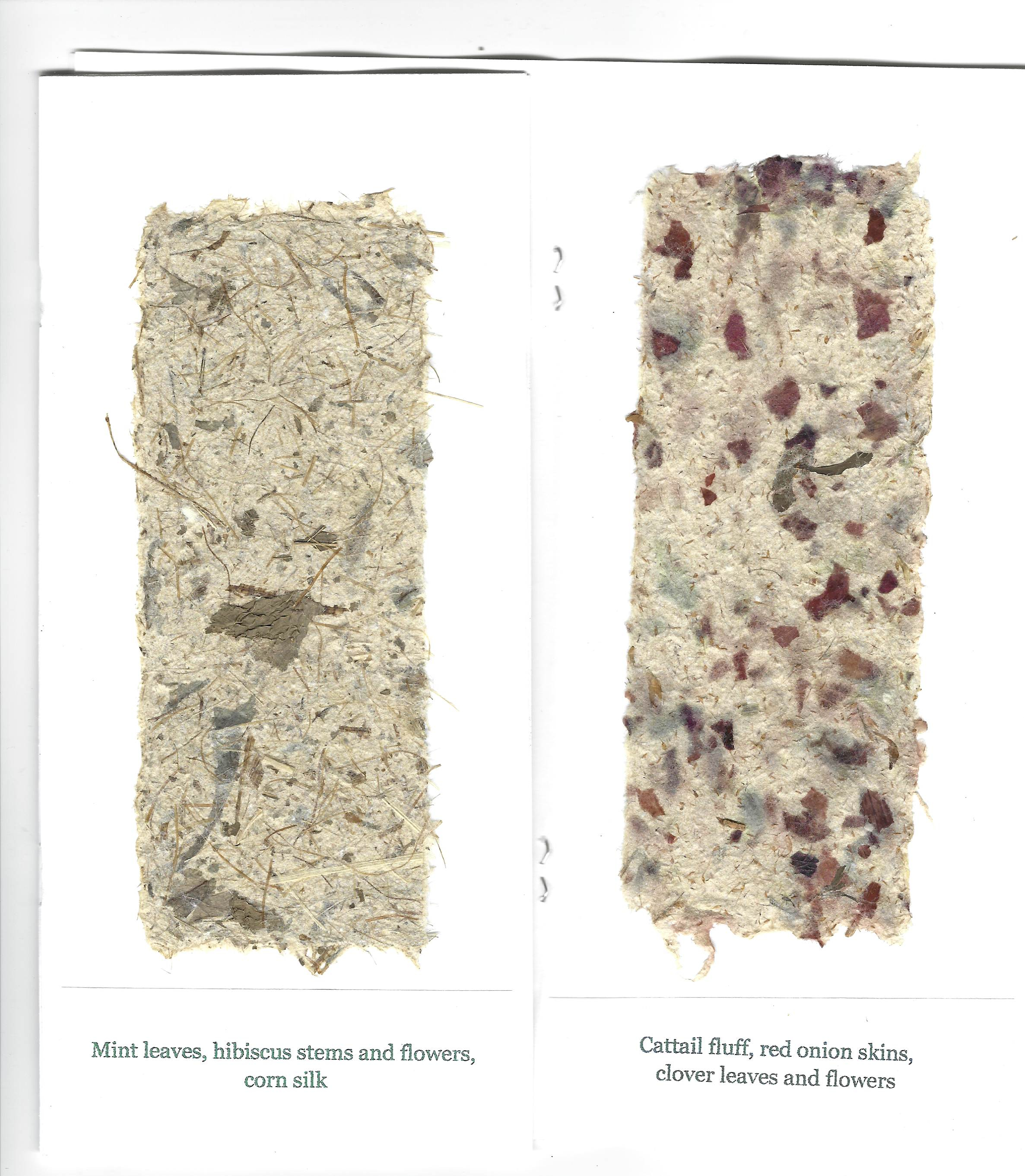 The materials from the list were combined with a small dose of grocery bag, cotton linter, and potato starch. Each sheet yielded 4 bookmark samples for the booklet.