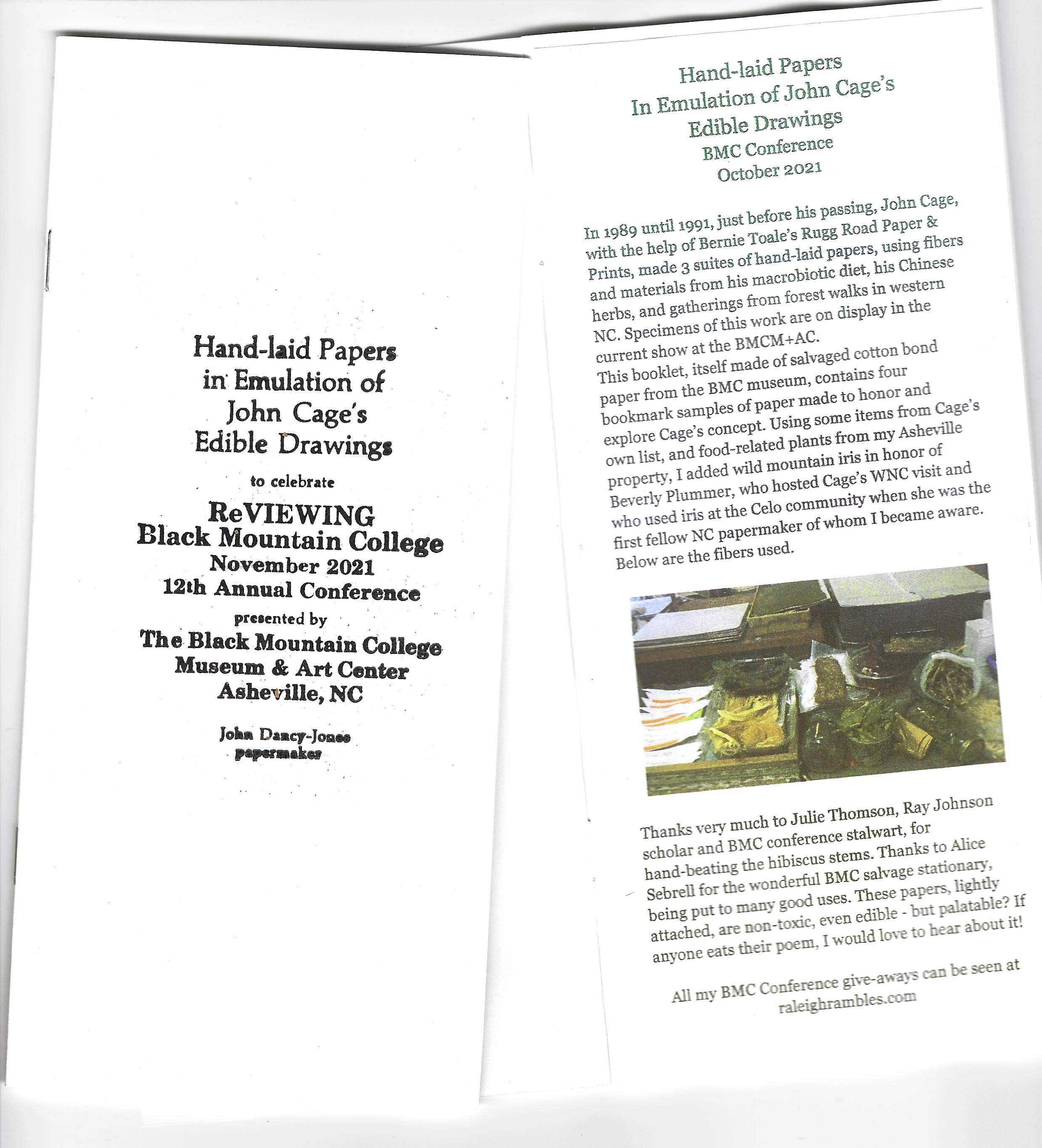The 12th annual ReVIEWing BMC conference starts tomorrow and I will be giving away a very special booklet. I was so amazed to find out that John Cage made paper, no less with Beverly Plummer, the first NC papermaker of whom I was aware, with the idea of eating a poem. He is the focus of this year’s conference, and so I created my most elaborate BMC project so far. I assembled a collection of fibers and other ingredients and combined them using random pairings and combinations. Cage used the I-Ching for the chance operations that were a hallmark of his work, but I just made item cards, shuffled chosen blindly to make groups.