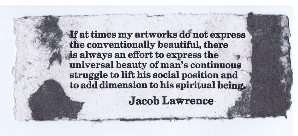 The 10th annual BMC conference takes place September 28-30, 2018 at the Reuters Center on UNC-A’s campus. A show of work examining his work and life at BMC opens September 28th in the BMC museum’s new space. This will be the 8th out of 10 I have attended; in recent years I have started creating a printed hand-laid paper object to give out. Above is this year’s, using a quote from the website of the Jacob and Gwen Knight Lawrence Center. Looking forward to it!
