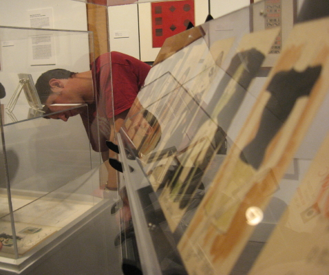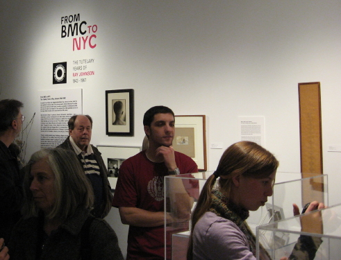The opening of the show was well attended and featured some aspects Ray might have liked very much, though he generally was quite ambivalent about exhibiting or selling or even saving his work. Poetix Vanguard offered spoken word performances during the event, and an open mike followed at a bar nearby. The BMCM+AC library, with many Ray J items prominent, provided a nice context for the highly varied show. Several of Hazel Larsen Archer’s gorgeous photos of Ray at BMC were on display. And Sebastian Matthews, collage artist himself and so clearly a Really Great Guy, presided with enthusiasm over the many energies he had gathered to celebrate the amazing career of Ray Johnson.