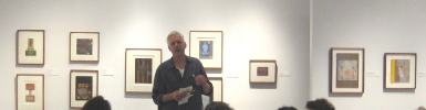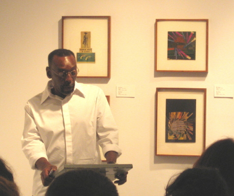 The show and especially its catalogue were already reviewed here, but several subsequent events have enriched the impact of the show. Dr. Francis F. L. Beatty (quoted and seen above), a curator who works with the Ray Johnson Estate, gave a lecture at the BMCM+AC on May 21, using parallel slides to show that Ray displays elements in his collages that link him to the major artistic trends of the day. His wit, humor and intense communications of all kinds were highly stimulating but hard to classify, but his collages and the palette he created out of found and encountered material can be seen as fully in the tradition of Klee’ as well as Albers, while partaking of the humor of Dada. “I don’t make pop art. I make chop art.” Ray’s statement refers to his use of old work in new, and Dr. Beatty skillfully elucidated the way in which Ray’s “chop art” (often meticulous geometric constructions) came right out of his Black Mountain experience. She makes a point that reverberated through this show: the liberation of American education happening at Black Mountain served as well to “liberate Ray Johnson.” He found himself, and he found the principle that best illuminates the breadth of his work for me: images standing in for words, words become imagery.