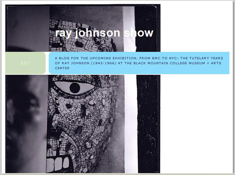 The Ray Johnson show at the Black Mountain College Museum in Asheville opened February 19th and will run through June 12, 2010. The opening was spectacular, the show is rich, varied and informative. For Ray J fans like me, the catalogue and it’s essays, assembled by show curator Sebastian Matthews, is the real treasure. Sebastian spent over a year studying Ray’s life and work, making connections with important people in Ray’s life (Ray passed in an act of suicide in 1995), and establishing his own perspective on the evolution of Ray’s art from a young art student in Detroit through a strong experience at Black Mountain College to an important role in the art scene of East Village in the 60’s and 70’s. The show displays extensive early work, including fairly typical ink doodles of 14 year old Ray, but also hilarious cards and visual puns from this period that presage his later work.