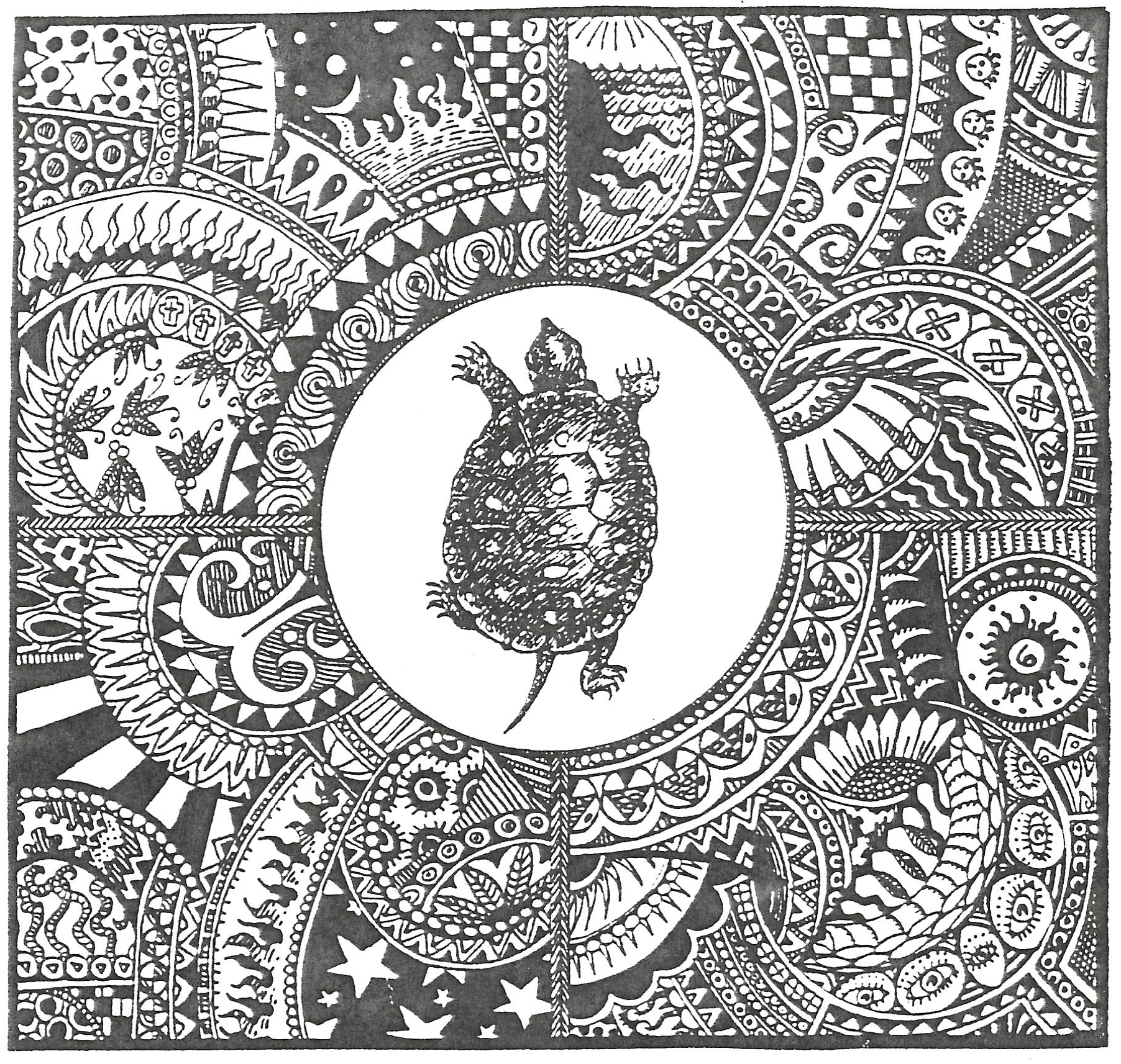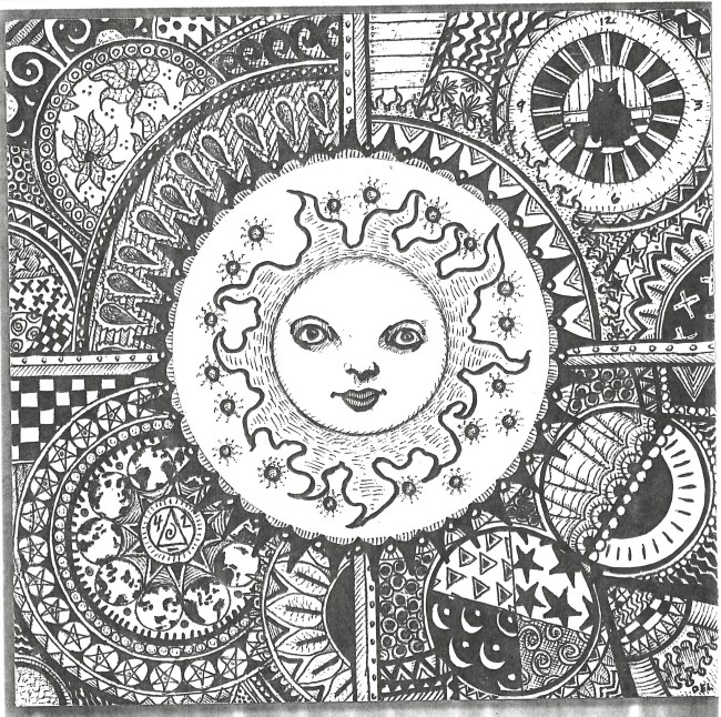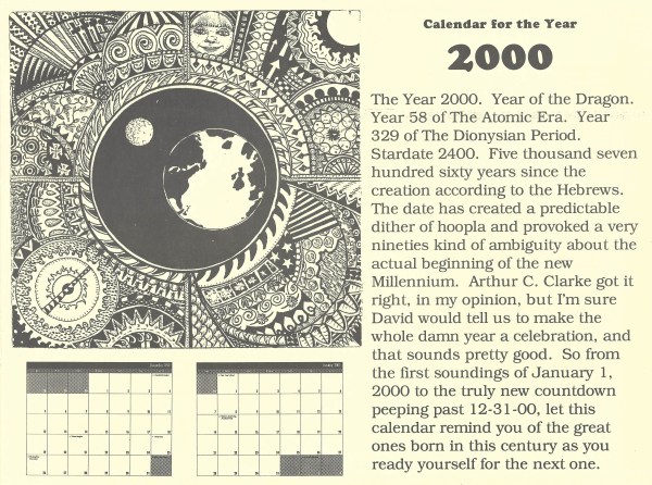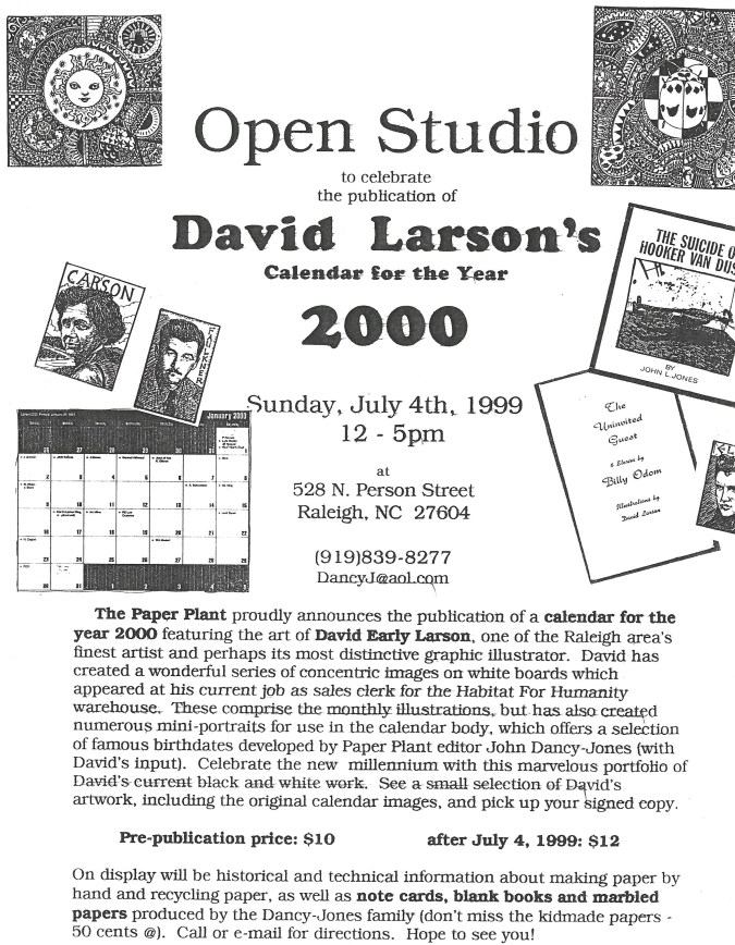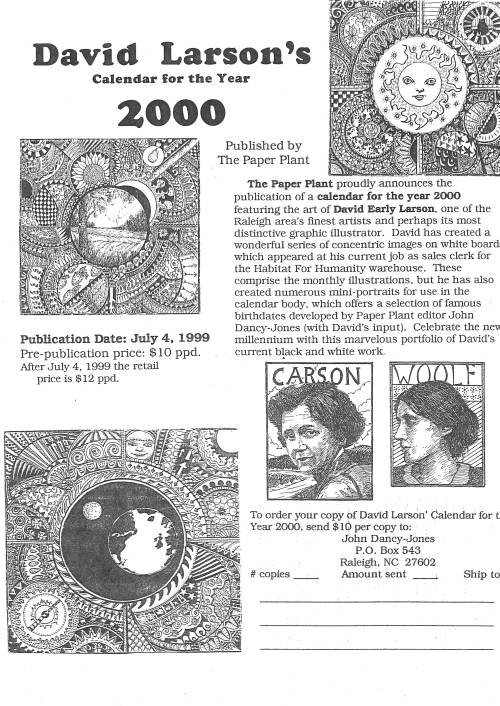 In 1999, David was working pretty fulltime at the Habitat Re-Store, and a stack of bright white 1 ft. square chipboard panels came in. David started designing images on them with Sharpie marker, a concentric frame of his art deco style with an interesting natural figure in the middle. After I had seen several of them, I told him if he finished 12 of them, we would publish a calendar. Everybody was going nuts over Y2K, from millennial prophecy to worldwide mainframe crashes from two missing digits, and I thought we could make something of that. The result was a monochrome calendar that sold very poorly with two exceptions: to friends at Paper Plant events and to customers at Habitat, who received a very deep discount. (and David got all the money). Nevertheless, the calendar has become a wonderful way to save and send a nice sample of David’s work.