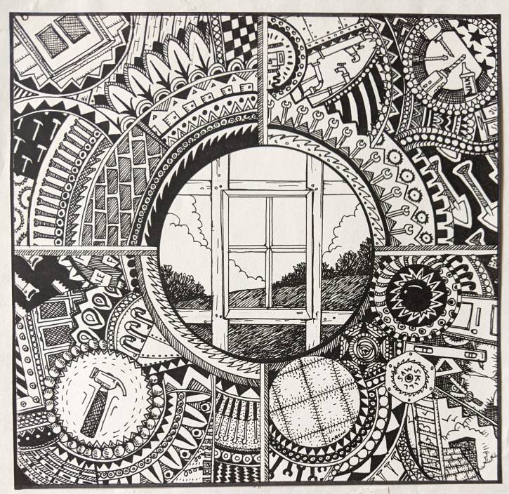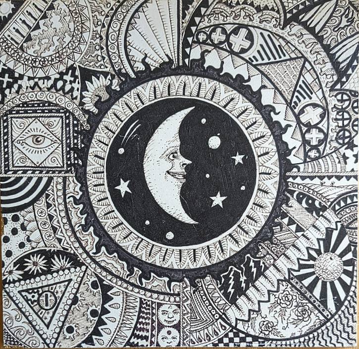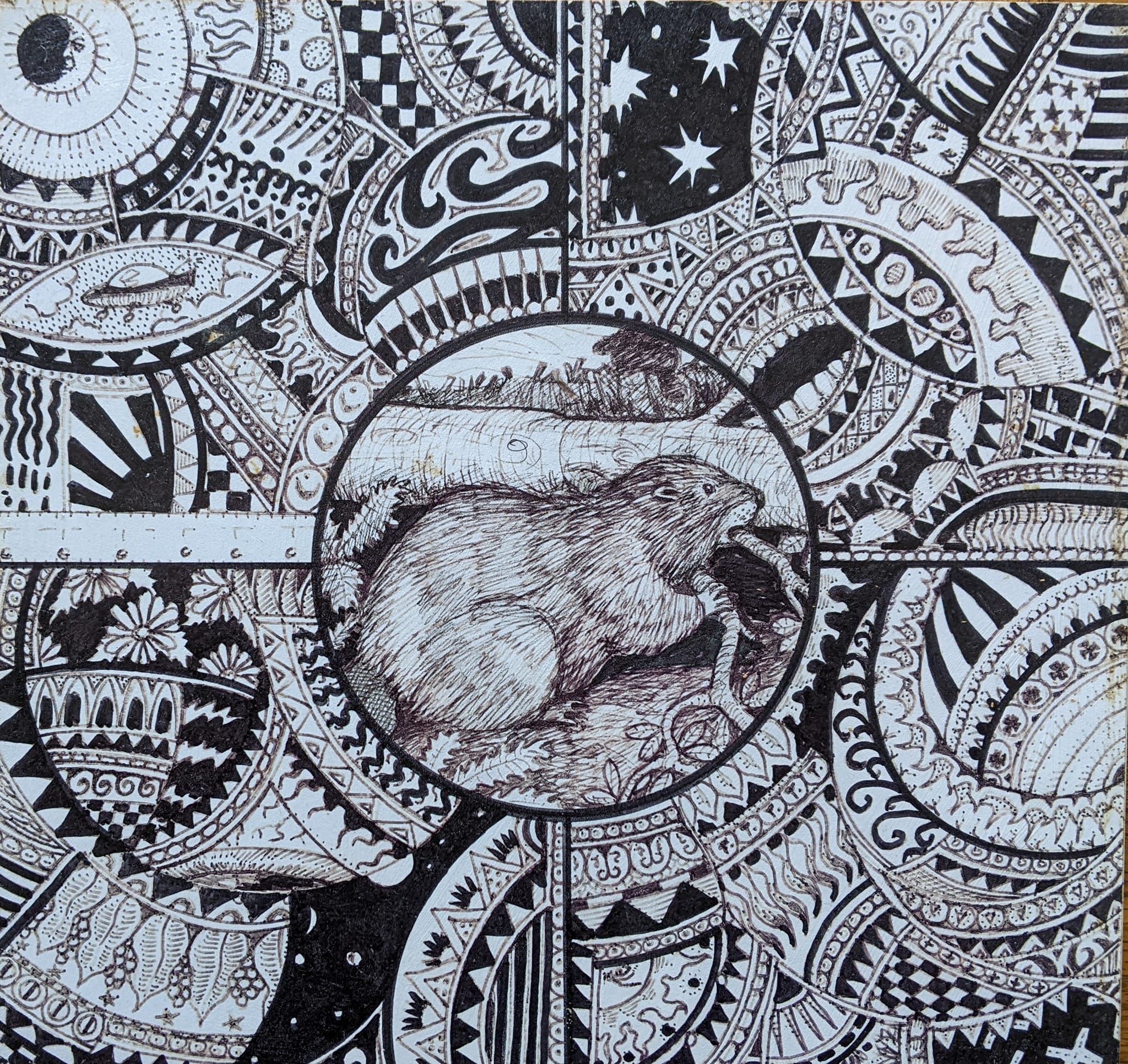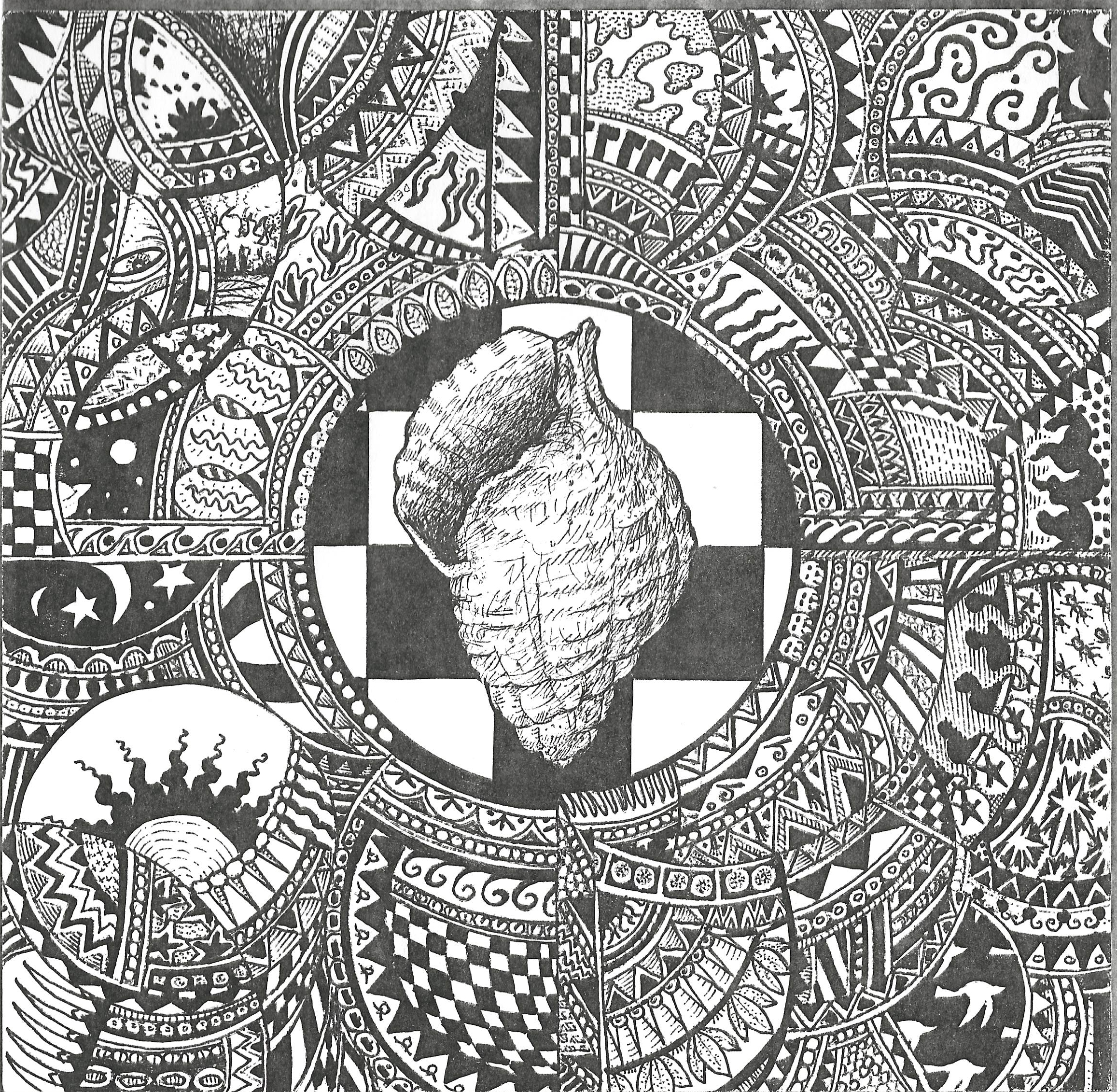 In 1999, David was working pretty fulltime at the Habitat Re-Store, and a stack of bright white 1 ft. square chipboard panels came in. David started designing images on them with Sharpie marker, a concentric frame of his art deco style with an interesting natural figure in the middle. After I had seen several of them, I told him if he finished 12 of them, we would publish a calendar. Everybody was going nuts over Y2K, from millennial prophecy to worldwide mainframe crashes from two missing digits, and I thought we could make something of that. The result was a monochrome calendar that sold very poorly with two exceptions: to friends at Paper Plant events and to customers at Habitat, who received a very deep discount. (and David got all the money). Nevertheless, the calendar has become a wonderful way to save and send a nice sample of David’s work.