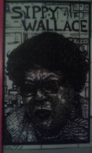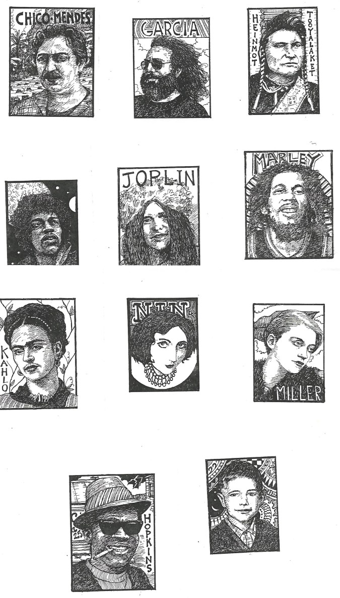 My favorite feature of the project was the bio sketches that David did (or had already done) which we used to illustrate their noted birthdate in the calendar. David regularly did this kind of work, using a photo, and turned them into stickers which he shared with friends. A spread of calendar pics in followed by some of this work.
