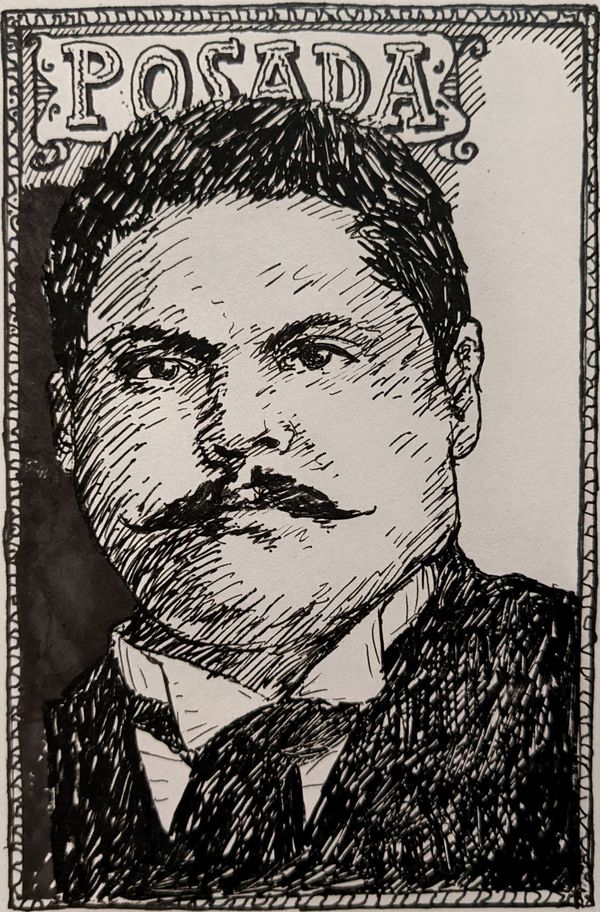 Born in 1852, Posada was able to set up his own lithography workshop and became a teacher of the craft in 1883 after his success from periodicals and newspapers publishing his works. A flood had him relocate to Mexico City in 1888 where he worked for La Patria Ilustrada, then joined a publishing firm where he created book covers, cartoons, and illustrations depicting various current events, using satire. From the beginning of the Mexican revolution in 1910 until his death in 1913, he worked tirelessly in the press honing his printmaking craft with features in the magazine El Jicote.